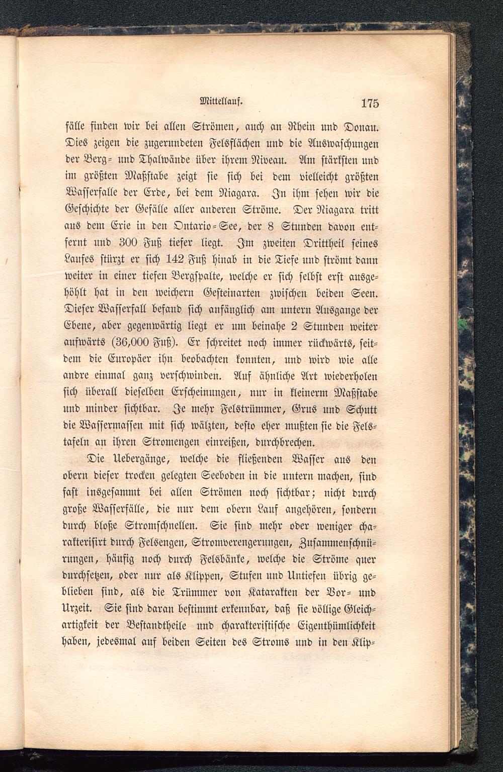 fälle finden wir bei allen Strömen, auch an Rhein und Donan.Dies zeigen die zugernndeten Felsflächen und die Auswaschungender Berg- und Thalwände über ihrem Niveau. Am stärksten undim größten Maßstabe zeigt sie sich bei dem vielleicht größtenWasserfalle der Erde, bei dem Niagara. In ihm sehen wir dieGeschichte der Gefälle aller anderen Ströme. Der Niagara trittaus dem Erie in den Ontario-See , der 8 Stunden davon ent-fernt nnd 300 Fuß tiefer liegt. Im zweiten Drittheil seinesLaufes stürzt er sich 142 Fuß hinab in die Tiefe nnd strömt dannweiter in einer tiefen Bergspalte, welche er sich selbst erst ausge-höhlt hat iu den weichern Gesteinarten zwischen beiden Seen.Dieser Wasserfall befand sich anfänglich am untern Ausgange derEbene, aber gegenwärtig liegt er um beinahe 2 Stunden weiteraufwärts (30,000 Fuß). Er schreitet noch immer rückwärts, seit-dem die Europäer ihn beobachten konnten, und wird wie alleandre einmal ganz verschwinden. Auf ähnliche Art wiederholensich überall dieselben Erscheinungen, nur in kleinerm Maßstabeund minder sichtbar. Je mehr Felstrümmer, Grus und Schuttdie Wassermassen mit sich wälzten, desto eher mußten sie die Fels-tafeln an ihren Stromengen einreißen, durchbrechen.