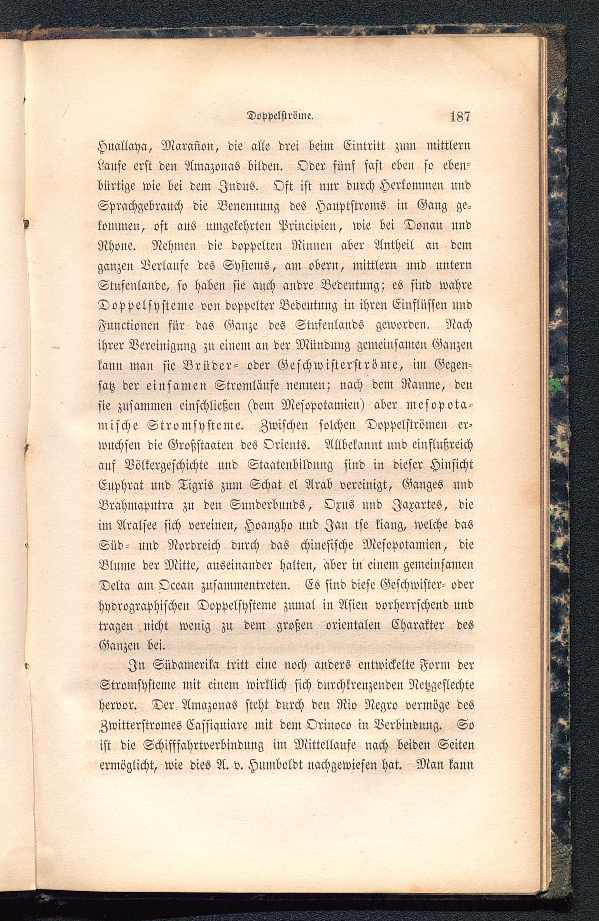 Hnallaya, Maranon, die alle drei beim Eintritt zum mittlernLaufe erst den Amazonas bilden. Oder fünf fast eben fo eben-bürtige wie bei dem Indus. Oft ist nur durch Herkommen undSprachgebrauch die Benennung des Hauptstroms in Gang ge-kommen, oft aus umgekehrten Principien, wie bei Donau undRhone . Nehmen die doppelten Rinnen aber Antheil an demganzen Verlanfe des Systems, am obern, mittlern und unternStufenlande, so haben sie auch andre Bedeutung; es sind wahreDoppelsysteme von doppelter Bedeutung in ihren Einflüssen undFunctionen für das Ganze des Stufenlands geworden. Nachihrer Vereinigung zu eiuem au der Münduug gemeinsamen Ganzenkann man sie Brüder- oder Geschwisterströme, im Gegen-satz der einsamen Stromläufe nennen; nach dem Raume, densie zusammen einschließen (dem Mesopotamien ) aber mesopota-mische Stromsysteme. Zwischen solchen Doppelströmen er-wuchsen die Großstaaten des Orients. Allbekannt und einflußreichauf Völkergeschichte und Staatenbildung sind in dieser HinsichtEuphrat uud Tigris zum Schat el Arab vereinigt, Ganges uudBrahmaputra zu den Sunderbunds, Oxus und Jaxartes, dieim Aralsee sich vereinen, Hoangho und Jan tse kiang, welche dasSüd- und Nordreich durch das chinesische Mesopotamien , dieBlume der Mitte, auseinander halten, aber in einem gemeinsamenDelta am Ocean zusammentreten. Es sind diese Geschwister- oderhydrographischen Doppelsysteme znmal in Asien vorherrschend undtragen nicht wenig zu dem großeu orientalen Charakter desGanzen bei.