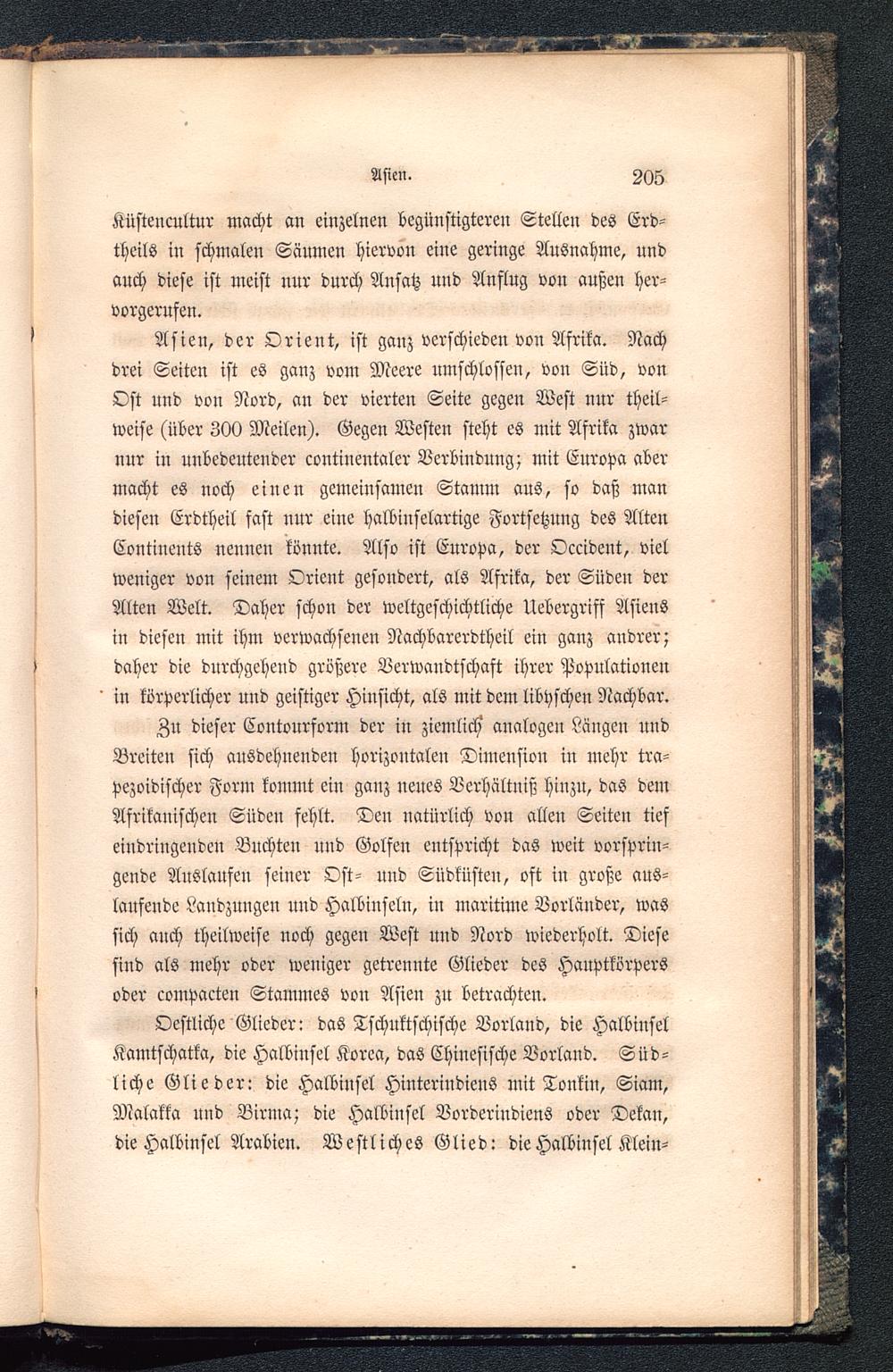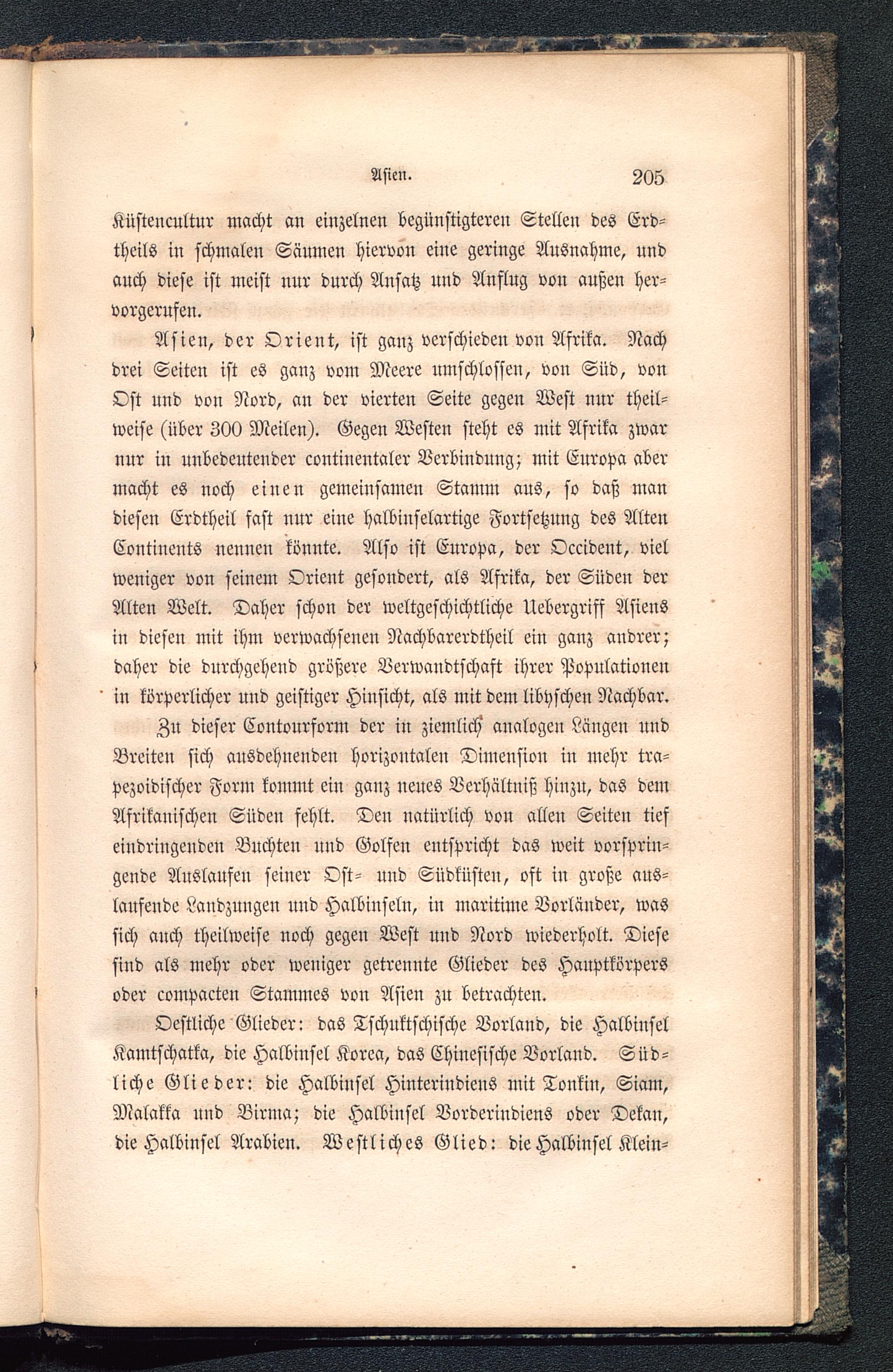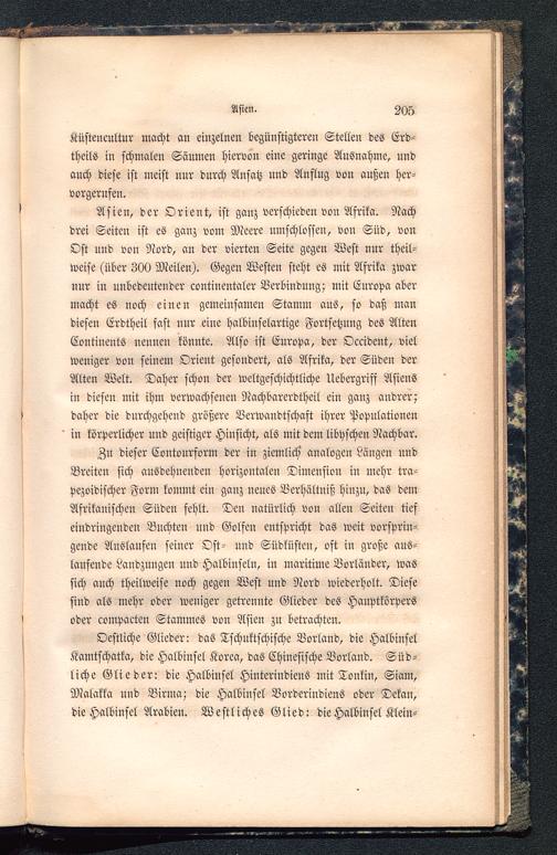 Zu dieser Contourform der in ziemlich' analogen Längen undBreiten sich ausdehnenden horizontalen Dimension in mehr tra-pezoidischer Form kommt ein ganz neues Verhältniß hinzu, das demAfrikanischen Süden fehlt. Den natürlich von allen Seiten tiefeindringenden Buchten und Golfen entspricht das weit vorsprin-gende Auslaufen seiner Ost- und Südküsten, oft in große aus-laufende Landzungen und Halbinseln, in maritime Vorländer, wassich anch theilweise noch gegen West und Nord wiederholt. Diesesind als mehr oder weniger getrennte Glieder des Hauptkörpersoder compacten Stammes von Asien zu betrachten.