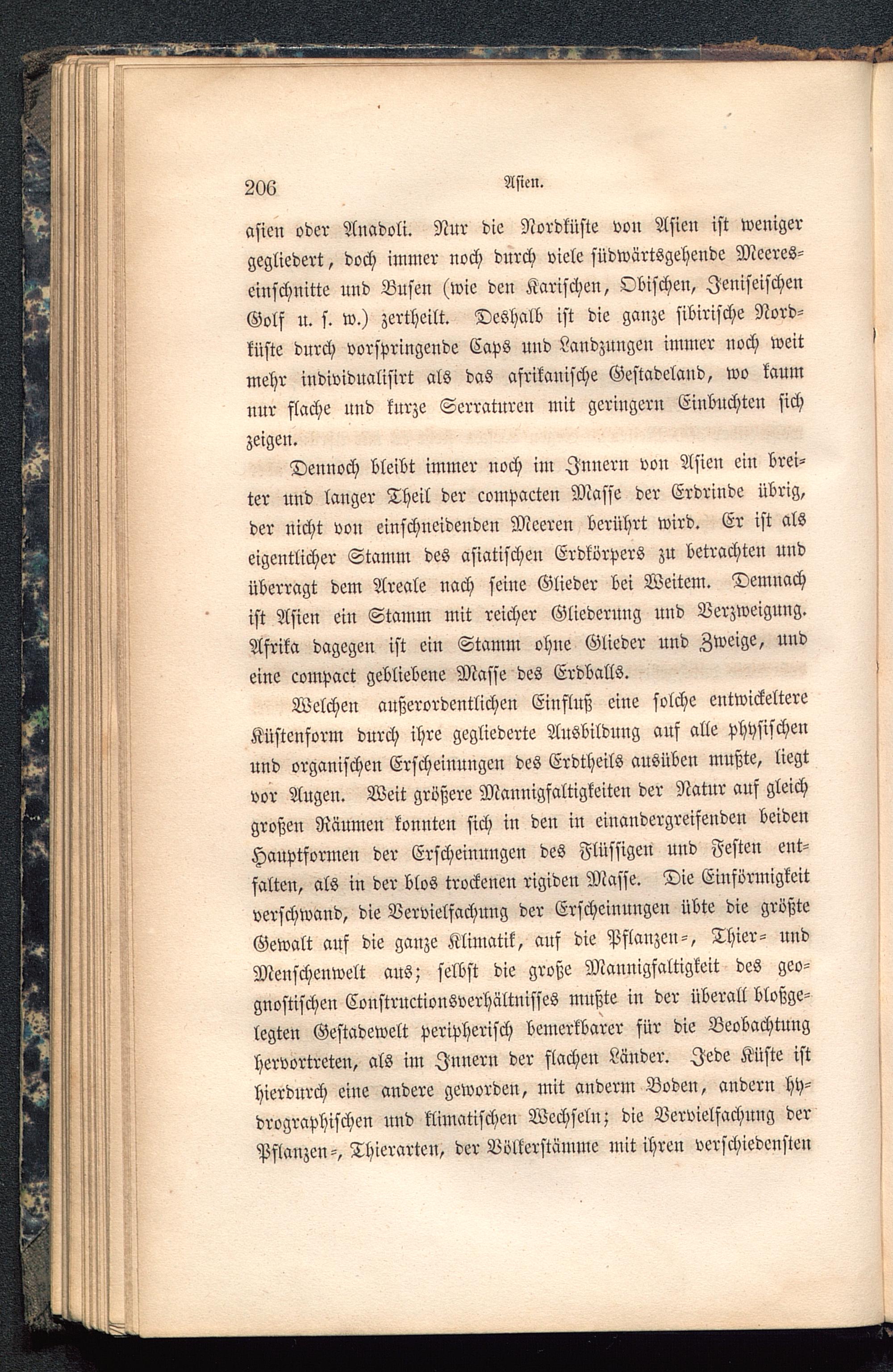 Dennoch bleibt immer noch im Innern von Asien ein brei-ter und langer Theil der compacten Masse der Erdrinde übrig,der nicht von einschneidenden Meeren berührt wird. Er ist alseigentlicher Stamm des asiatischen Erdkörpers zu betrachten undüberragt dem Areale nach seine Glieder bei Weitem. Demnachist Asien ein Stamm mit reicher Gliederung und Verzweigung.Afrika dagegen ist ein Stamm ohne Glieder und Zweige, undeine compact gebliebene Masse des Erdballs.