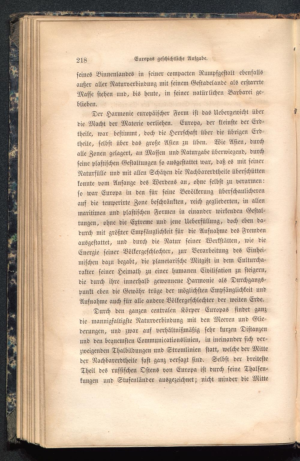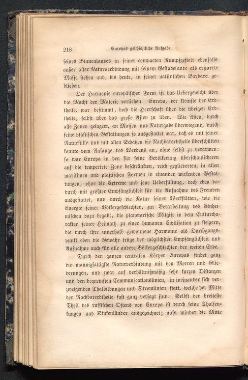 Der Harmonie europäischer Form ist das Uebergewicht überdie Macht der Materie verliehen. Europa , der kleinste der Erd-theile, war bestimmt, doch die Herrschaft über die übrigen Erd-theile, selbst über das große Asien zu üben. Wie Asien , durchalle Zoneu gelagert, au Massen und Natnrgabe überwiegend, durchseine plastischen Gestaltungen so ausgestattet war, daß es mit seinerNaturfülle und mit allen Schätzen die Nachbarerdtheile überschüttenkonnte vom Anfange des Werdens an, ohne selbst zu verarmen:so war Europa iu den für seine Bevölkerung überschaulicherenauf die temperirte Zone beschränkten, reich gegliederten, in allenmaritimen und plastischen Formen in einander wirkenden Gestal-tungen, ohne die Extreme und jene Ueberfüllnng, doch eben da-durch mit größter Empfänglichkeit für die Aufnahme des Fremdenausgestattet, und durch die Natur seiner Werkstätten, wie dieEnergie seiner Völkergeschlechter, zur Verarbeitung des Einhei-mischen dazu begabt, die planetarische Mitgift in dem Culturcha-rakter seiner Heimath zu einer humanen Civilisation zu steigern,die durch ihre innerhalb gewonnene Harmonie als Durchgangs-pnnkt eben die Gewähr trüge der möglichsten Empfänglichkeit undAufnahme auch für alle andere Völkergeschlechter der weiten Erde.
