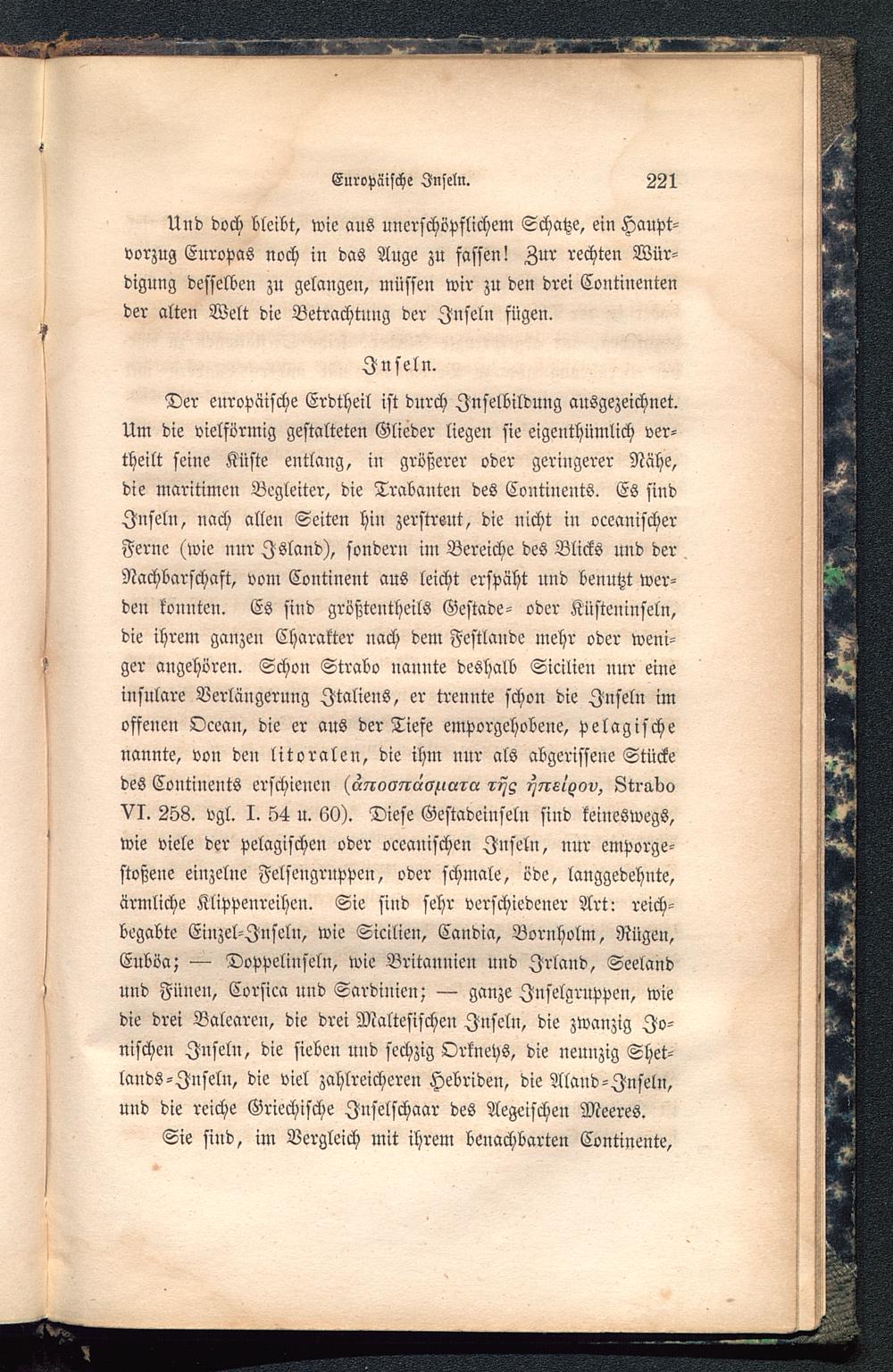 Der europäische Erdtheil ist durch Jnselbilduug ausgezeichnet.Um die vielförmig gestalteten Glieder liegen sie eigenthümlich ver-theilt seine Küste entlang, in größerer oder geringerer Nähe,die maritimen Begleiter, die Trabanten des Coutinents. Es sindInseln, nach allen Seiten hiu zerstreut, die nicht in oceanischerFerne (wie nur Island ), sondern im Bereiche des Blicks und derNachbarschaft, vom Continent aus leicht erspäht und benutzt wer-den konnten. Es sind größteuthcils Gestade- oder Küsteuinseln,die ihrem ganzen Charakter nach dem Festlaude mehr oder weni-ger angehören. Schon Strabo nannte deshalb Sicilien nur eineinsulare Verlängerung Italiens , er trennte schon die Inseln imoffenen Ocean, die er aus der Tiefe emporgehobene, pelagifchenannte, von den litoralen, die ihm nur als abgerissene Stückedes Contiuents erschienen («TrosTr«^««?« ^?re/^ov, Lti-akoVI. 258. vgl. I. 54 u. 60). Diese Gestadeinseln sind keineswegs,wie viele der pelagischen oder oceanischen Inseln, nur emporge-stoßene einzelne Felsengruppen, oder schmale, öde, langgedehnte,ärmliche Klippenreihen. Sie sind sehr verschiedener Art: reich-begabte Eiuzel-Jnseln, wie Sicilien, Candia, Bornholm , Rügen,Euböa; — Doppelinseln, wie Britannien und Irland , Seelandund Fünen, Corsica und Sardinien ; — ganze Inselgruppen, wiedie drei Balearen, die drei Maltesischen Inseln, die zwanzig Io-nischen Inseln, die sieben und sechzig Orknehs, die neunzig Shet-lauds-Inseln, die viel zahlreicheren Hebriden , die Aland-Inseln,und die reiche Griechische Inselschaar des Aegeischen Meeres.