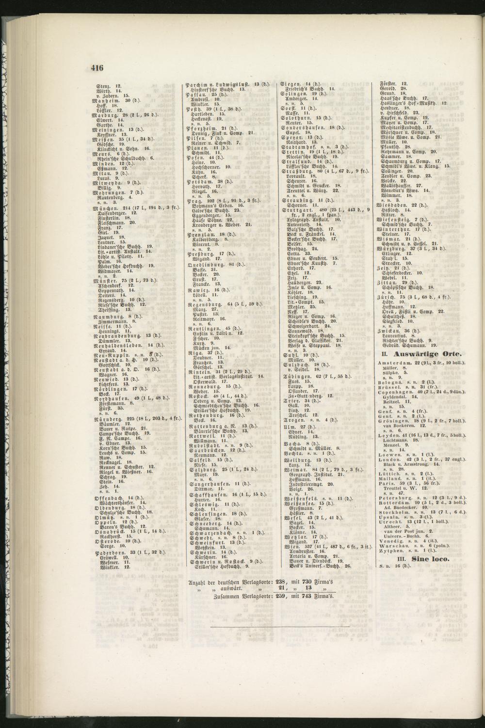 Anzahl der deutschen Verlagsorte: 238, mit 730 Firma's„ auswärt. „ 21, „ 13 „