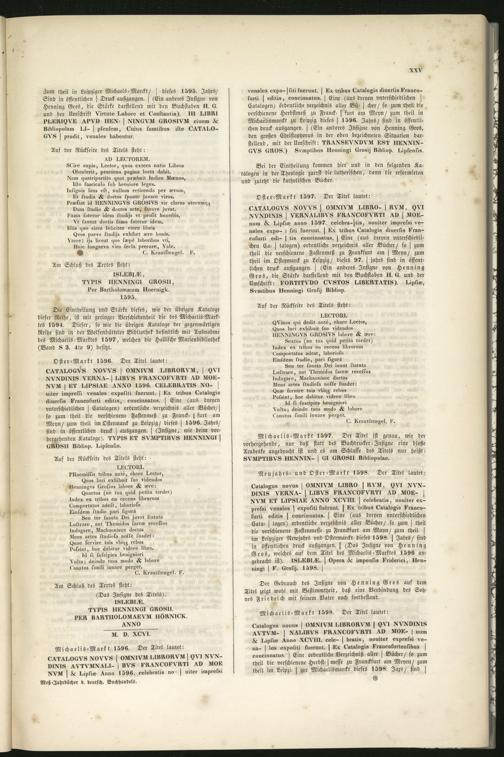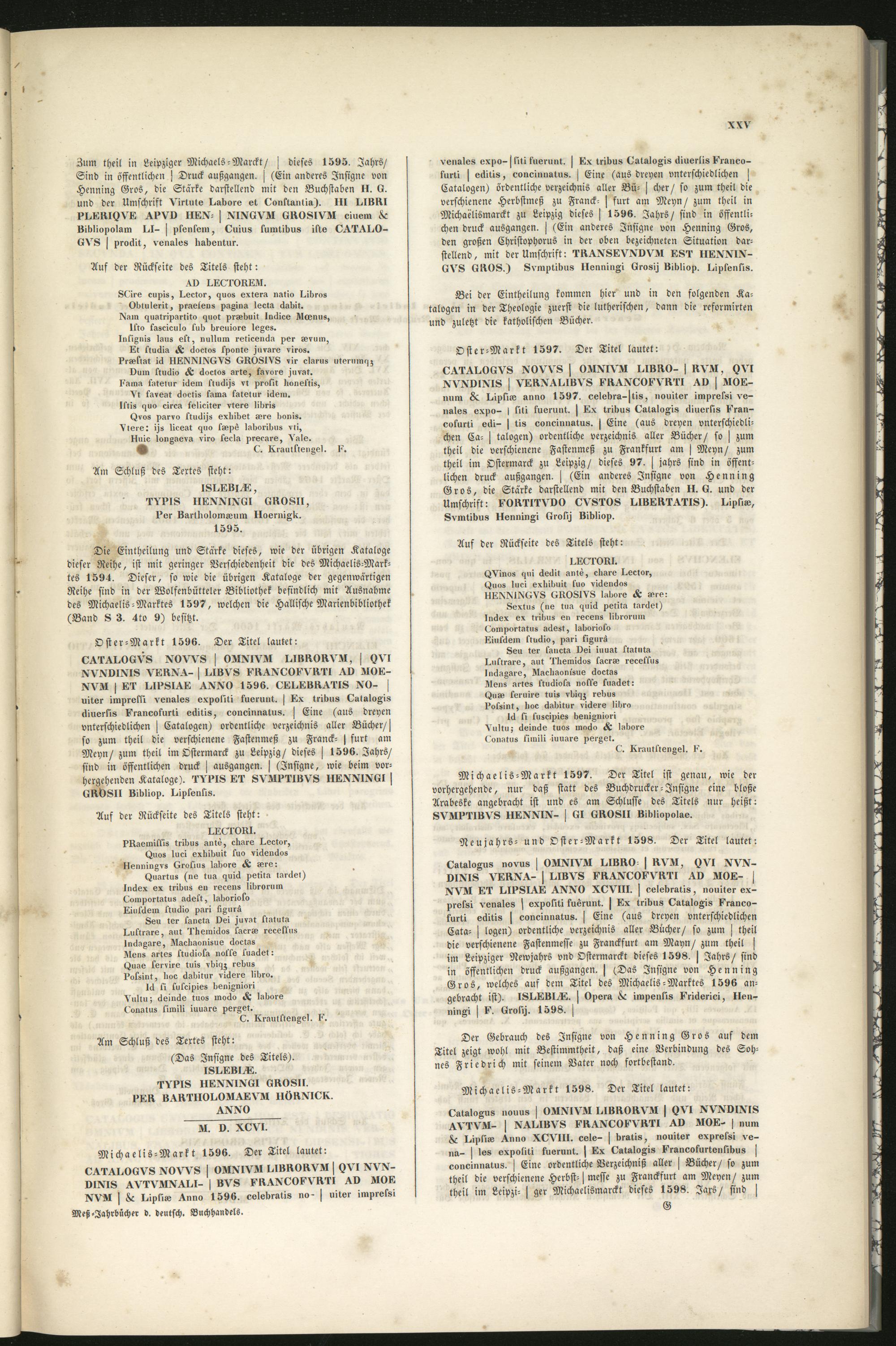 XVAl I^IP8I^L! ^XXO XOVIII. > eelebrati8, nouiter ex-pret8t vensle8 ^ expokiti kuerunt. j Lx tribus t?ataloK>8 k'rg.ooo-kurti eäiti8 ^ coueinnatus. ^ Eine (aus dreyen vnterschiedlichenCata- ^ logen) ordentliche Verzeichnis aller Bücher/ so zum ^ theildie »erschienene Fastenmesse zu Franckfurt am Mayn/ zum theil >im Leipziger Newjahrs vnd Ostermarckt dieses 1598. ^ Jahrs/ sindin öffentlichen druck außgangen. j (Das Jnsigne von HenningGros, welches auf dem Titel des Michaelis-Marktes 1596 an-gebracht ist). I8I^VIvL. ^ Opera ^ impeukis I'rideriei, llen-nmxi > «roki^. 1598. ^