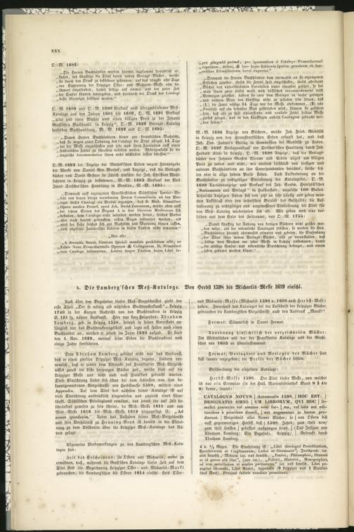 Dem Abraham Lamberg gebührt nicht nur das Verdienst,daß er einen zweiten Leipziger Meß-Katalog begann, sondern vor-nemlich, daß er hinter dem Abdrucke des Frankfurter Meß-Verzeich-nisses zuerst die Liste derjenigen Bücher gab, welche blos auf dieLeipziger Messe und nicht auch nach Frankfurt gebracht wurden.Diese Einrichtung findet sich schon bei dem frühesten von ihm be-kanntgewordenen Verzeichnisse von Herbstmesse 1598, mittels eines^ppenciix. Auf dem Titel des nächsten seiner Kataloge ist aufdiese Einrichtung ausdrücklich hingewiesen und zugleich eines Chur-fürst!. Sächsischen Privilegiums erwähnt, das jedoch ein auf Zeit be-schränktes gewesen zu sein scheint, da Mich.-Messe 1611 und vonMich.-Messe 1616 bis Mich.-Messe 1619 hinzugefügt ist: „^VäANN0S yuiriclooim." Ueber das Aufhören seiner Meß-Verzeichnisseund sein Verhältniß zu Henning Gros ist bereits in der Einlei-tung zu dem Abschnitte über die Leipziger Meß-Kataloge das Nä-here gesagt.