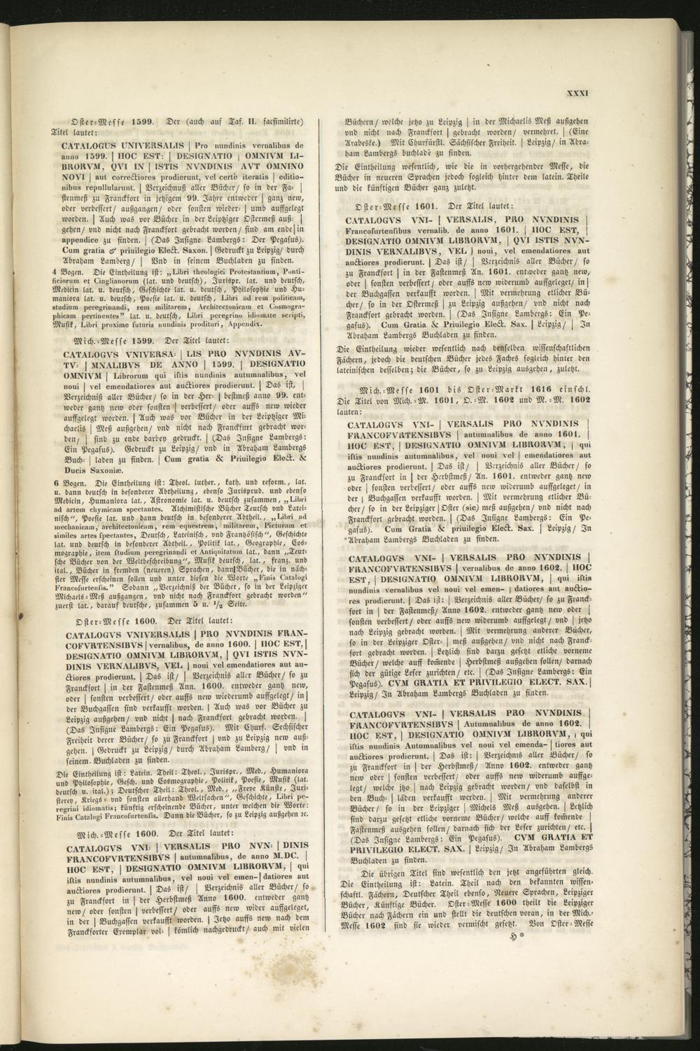 Die übrigen Titel sind wesentlich den jetzt angeführten gleich.Die Eintheilung ist: Latein . Theil nach den bekannten wissen,schaftl. Fächern, Deutscher Theil ebenso, Neuere Sprachen, LeipzigerBücher, Künftige Bücher. Oster-Messe 1600 theilt die Leipziger Bücher nach Fächern ein und stellt die deutschen voran, in der Mich.-Messe 1602 sind sie wieder vermischt gesetzt. Von Oster-Messe