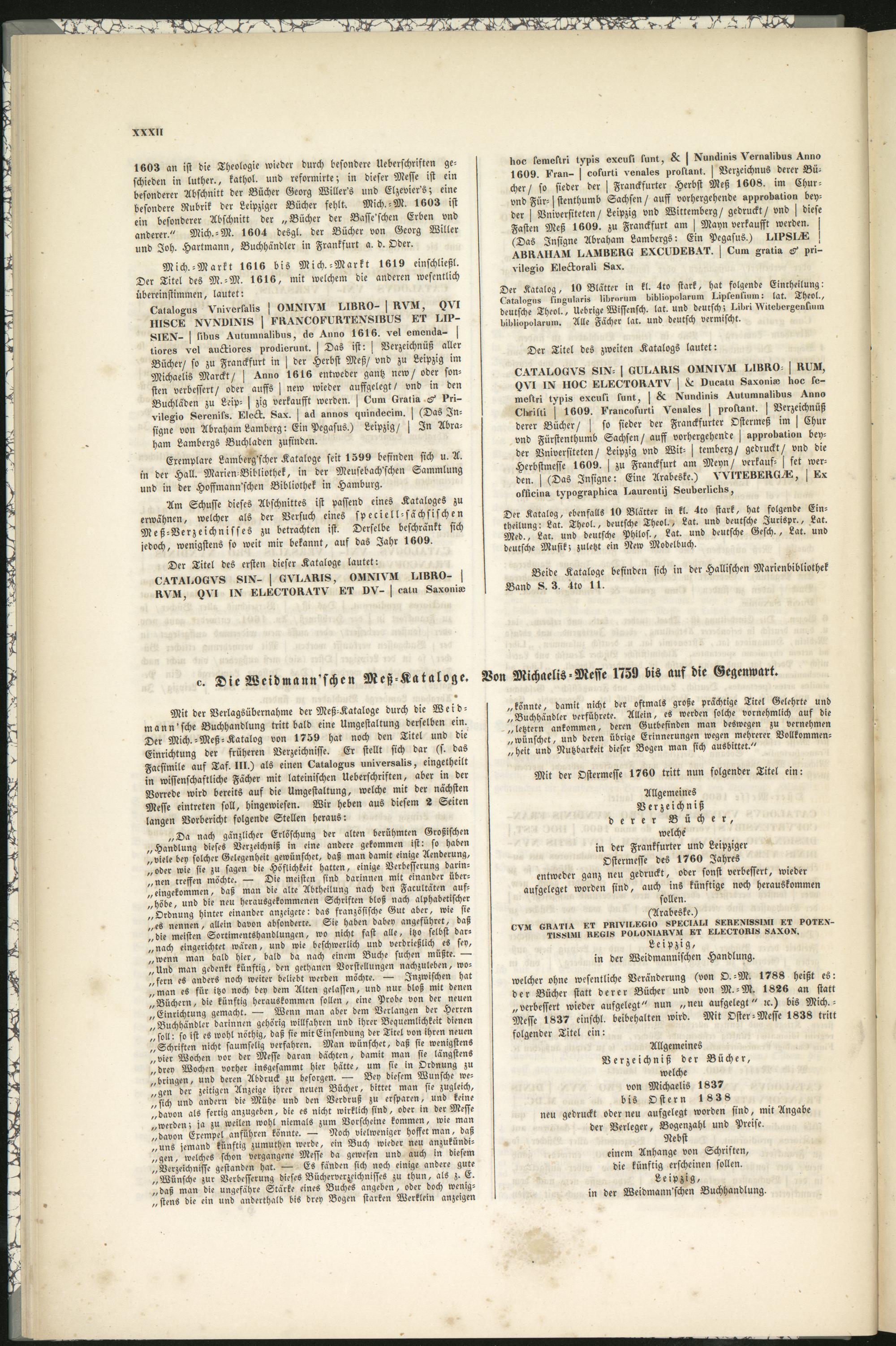 Mit der Verlagsübernahme der Meß-Kataloge durch die Weid-mann'sche Buchhandlung tritt bald eine Umgestaltung derselben ein.Der Mich.-Meß-Katalog von 1759 hat noch den Titel und dieEinrichtung der früheren Verzeichnisse. Er stellt sich dar (s. dasFacsimile auf Taf. III.) als einen OataloKus universalis, eingetheiltin wissenschaftliche Fächer mit lateinischen Ueberschriften, aber in derVorrede wird bereits auf die Umgestaltung, welche mit der nächstenMesse eintreten soll, hingewiesen. Wir heben aus diesem S Seitenlangen Vorbericht folgende Stellen heraus:
