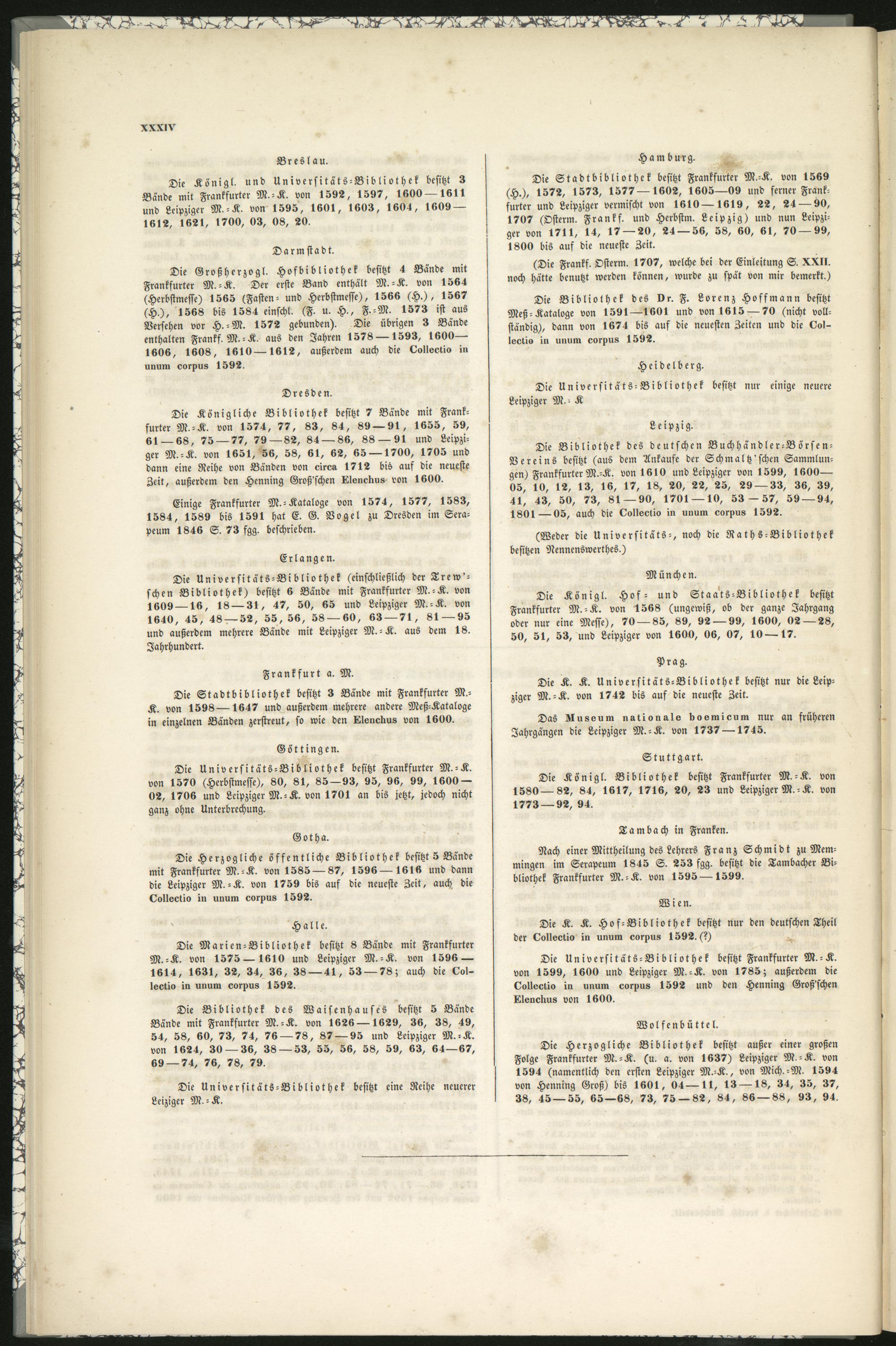 Die Universitats-Bibliothek besitzt Frankfurter M.-K.von 1570 (Herbstmesse), 80, 81, 85—93, 95, 96, 99, 1600 —02, 1706 und Leipziger M.-K. von 1701 an bis jetzt, jedoch nichtganz ohne Unterbrechung.