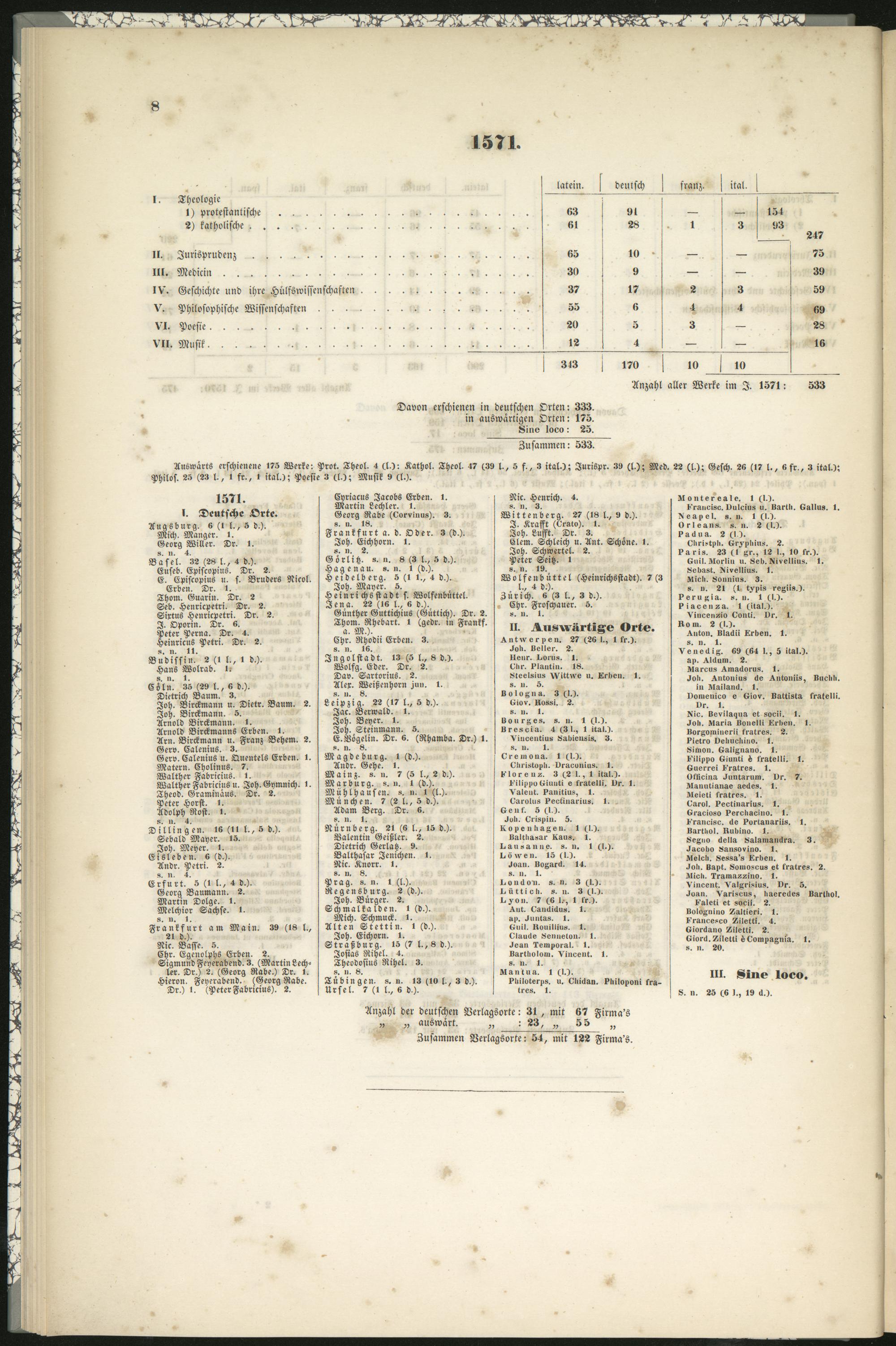 Auswärts erschienene 175 Werke: Prot. Theol. 4 (l): Kathol. Theol- 47 (39 l-, 5 f., 3 ital.); Jurispr. 39 (l.); Med. SS (l.); Gesch. S« (17 l>,Philos. 25 (S3 l., i fr., i ital.); Poesie 3 (l.); Musik 9 cl.).