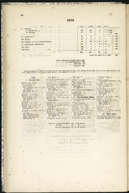 Auswärts erschienene 183 Werke: Prot. Thcol. 21 (19l-, 2fr.); Kath. Theol. 2« (25 l-, l fr.); Jurispr. 37 (l.); Med- 12 (II l., i fr.); Gesch. 22 (IS l., 3 fr.,4 ital.); Philos. 37 (33 l., 2 fr., 2 ital.); Poesie 13 (10 l., 3 fr.); Musik IS (7 l., 8 d.).