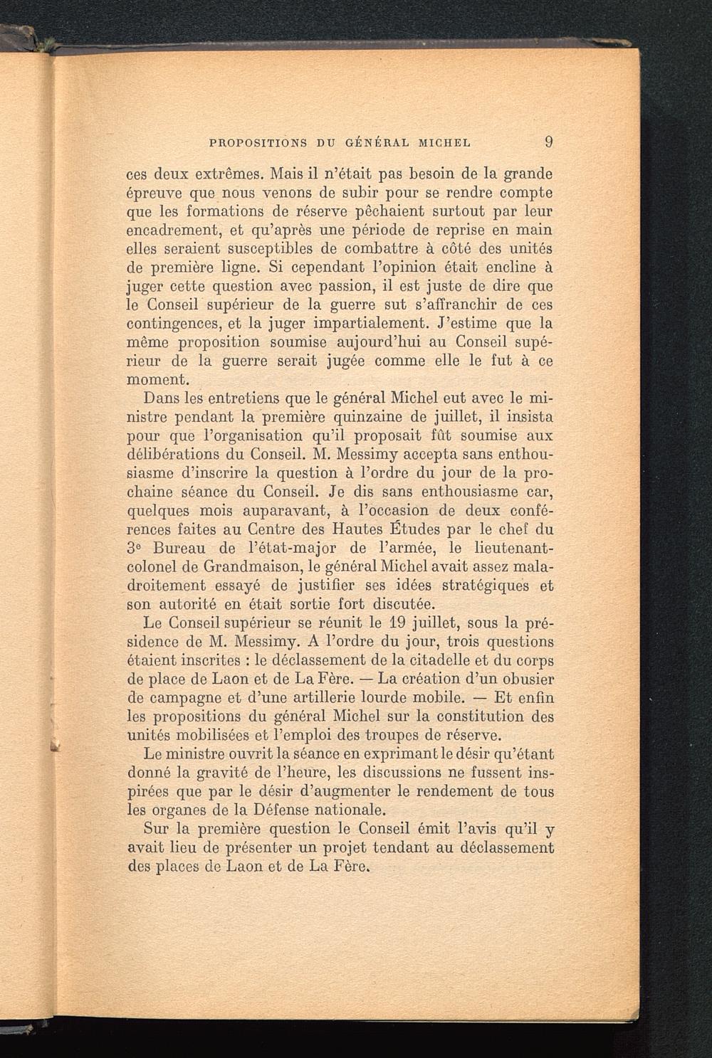 Dans les entretiens que le général Michel eut avec le mi-nistre pendant la première quinzaine de juillet, il insistapour que l’organisation qu’il proposait fût soumise auxdélibérations du Conseil. M. Messimy accepta sans enthou-siasme d’inscrire la question à l’ordre du jour de la pro-chaine séance du Conseil. Je dis sans enthousiasme car,quelques mois auparavant, à l’occasion de deux confé-rences faites au Centre des Hautes Études par le chef du3 e Bureau de l’état-major de l’armée, le lieutenant-colonel de Grandmaison, le général Michel avait assez mala-droitement essayé de justifier ses idées stratégiques etson autorité en était sortie fort discutée.