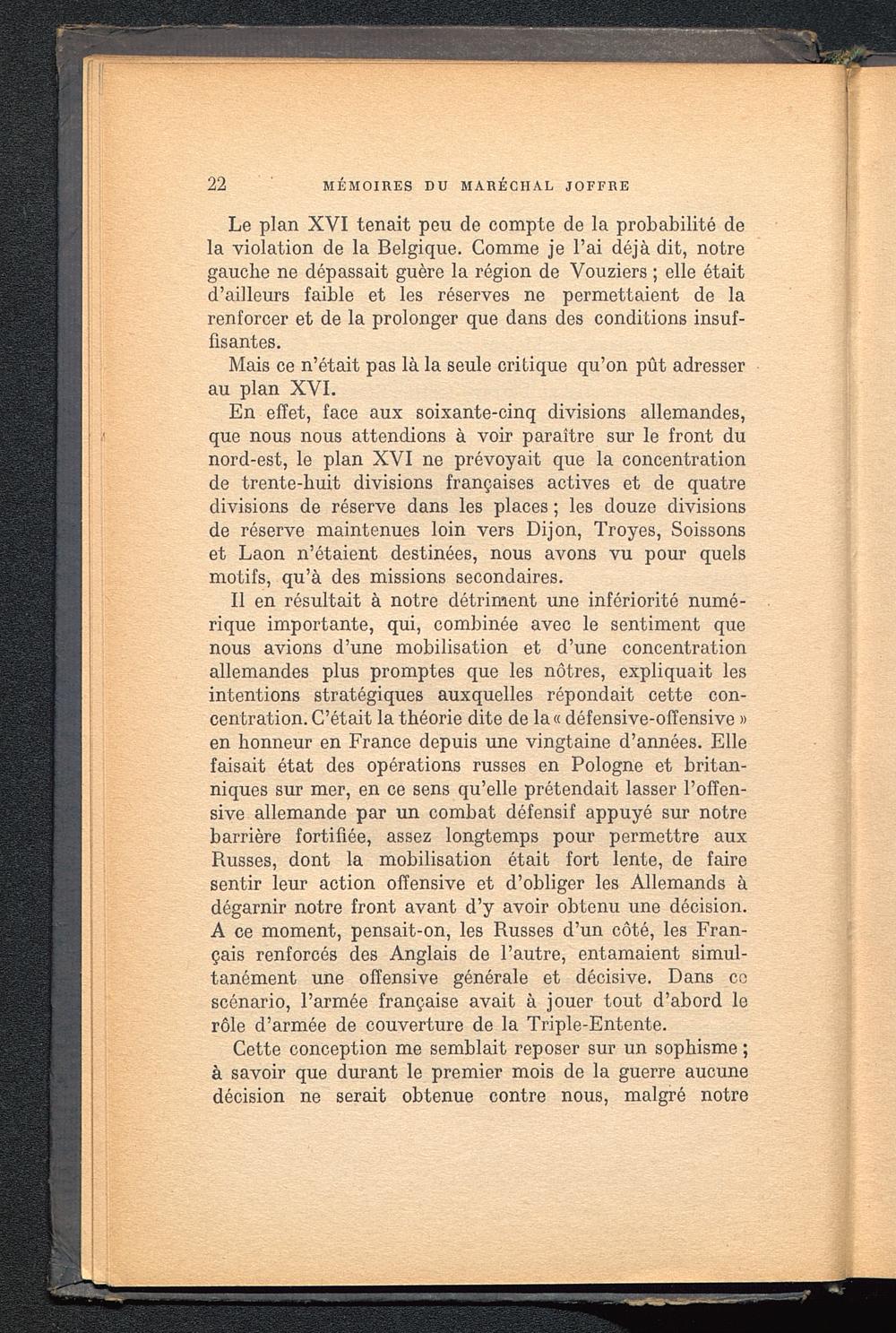 Le plan XVI tenait peu de compte de la probabilité dela violation de la Belgique . Comme je l’ai déjà dit, notregauche ne dépassait guère la région de Vouziers ; elle étaitd’ailleurs faible et les réserves ne permettaient de larenforcer et de la prolonger que dans des conditions insuf-fisantes.