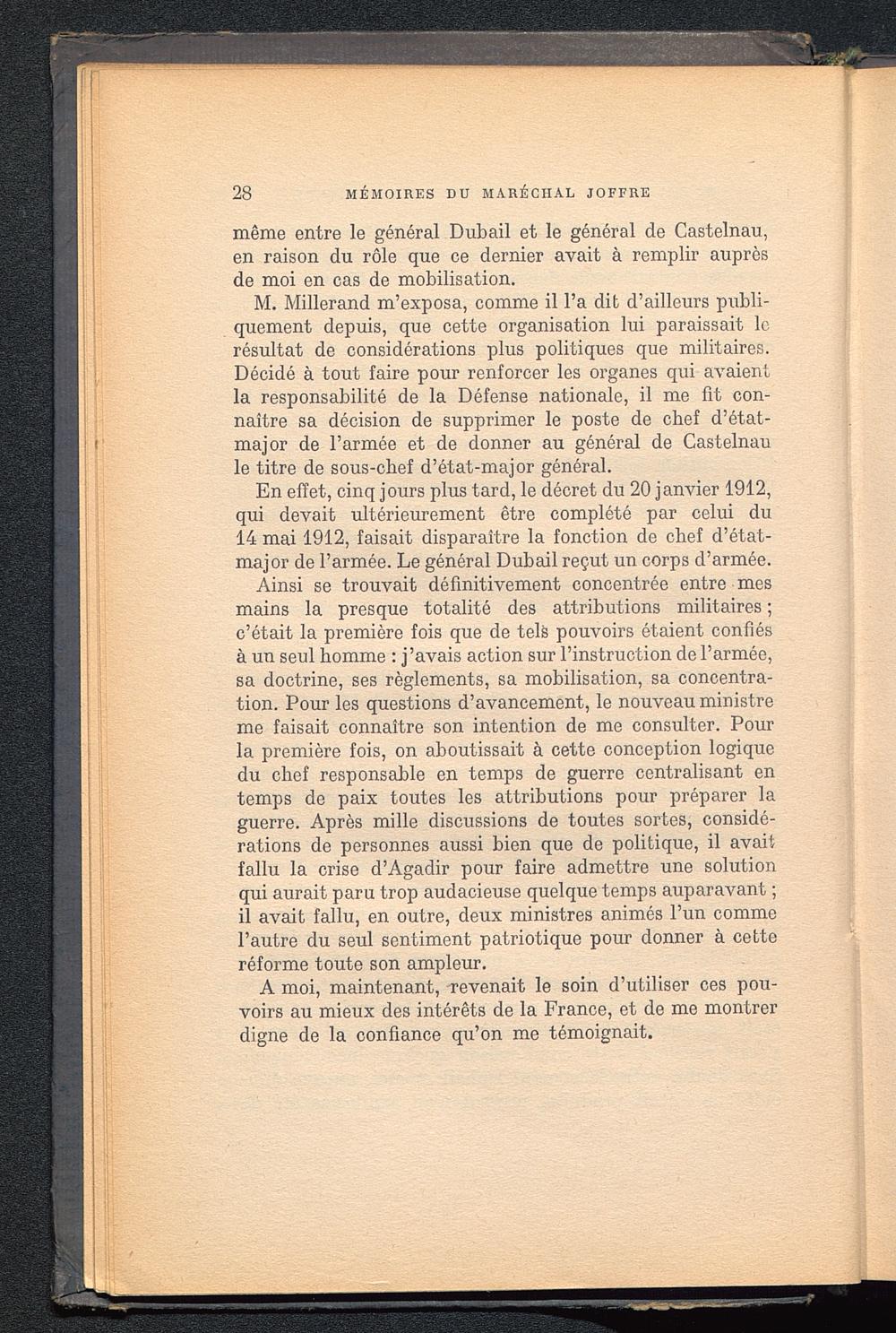 En effet, cinq jours plus tard, le décret du 20 janvier 1912,qui devait ultérieurement être complété par celui du14 mai 1912, faisait disparaître la fonction de chef d’état-major de l’armée. Le général Dubail reçut un corps d’armée.