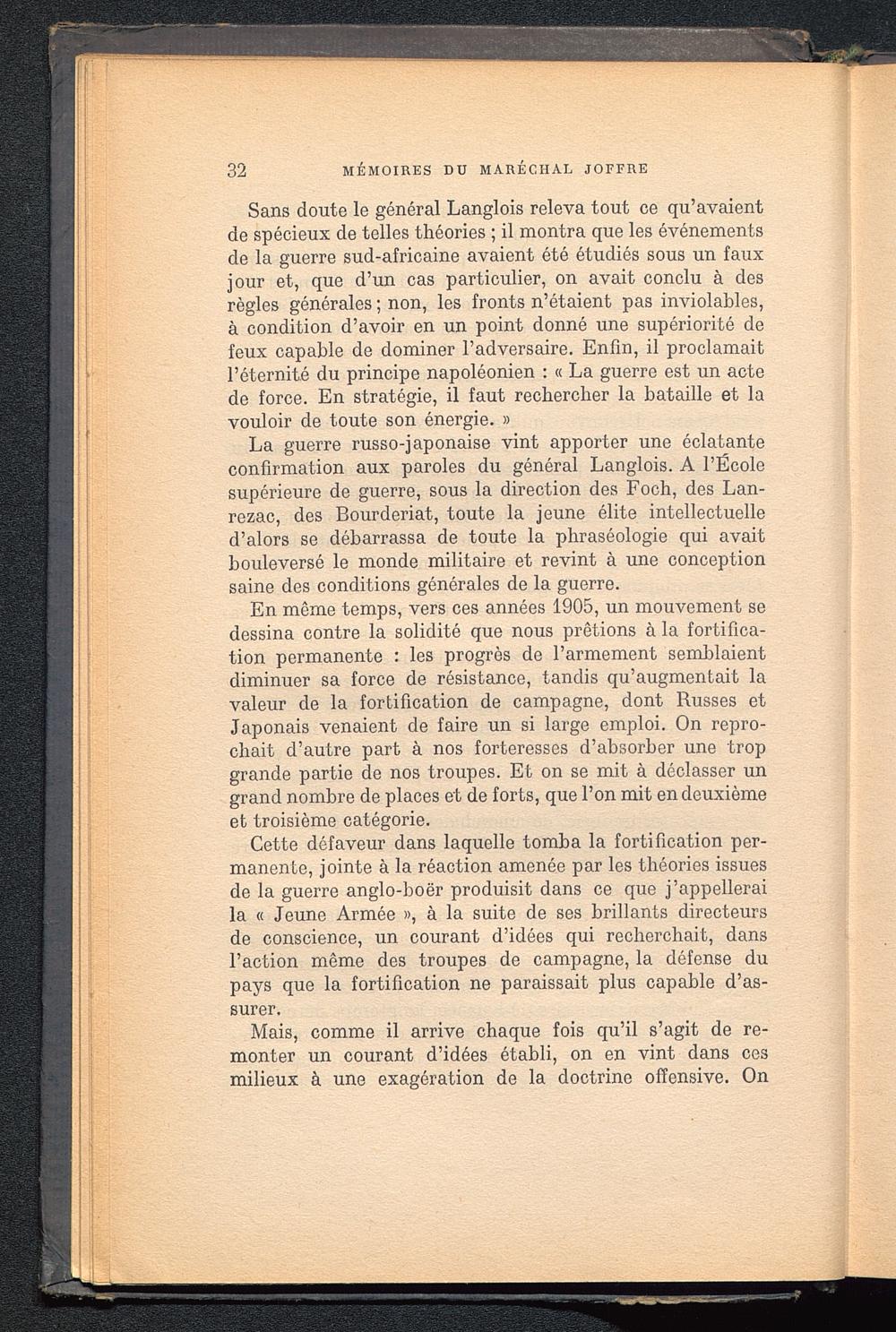 La guerre russo-japonaise vint apporter une éclatanteconfirmation aux paroles du général Langlois. A l’Écolesupérieure de guerre, sous la direction des Foch, des Lan-rezac, des Bourderiat, toute la jeune élite intellectuelled’alors se débarrassa de toute la phraséologie qui avaitbouleversé le monde militaire et revint à une conceptionsaine des conditions générales de la guerre.