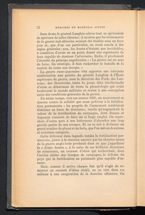 Cette défaveur dans laquelle tomba la fortification per-manente, jointe à la réaction amenée par les théories issuesde la guerre anglo-boër produisit dans ce que j’appelleraila « Jeune Armée », à la suite de ses brillants directeursde conscience, un courant d’idées qui recherchait, dansl’action même des troupes de campagne, la défense dupays que la fortification ne paraissait plus capable d’as-surer.