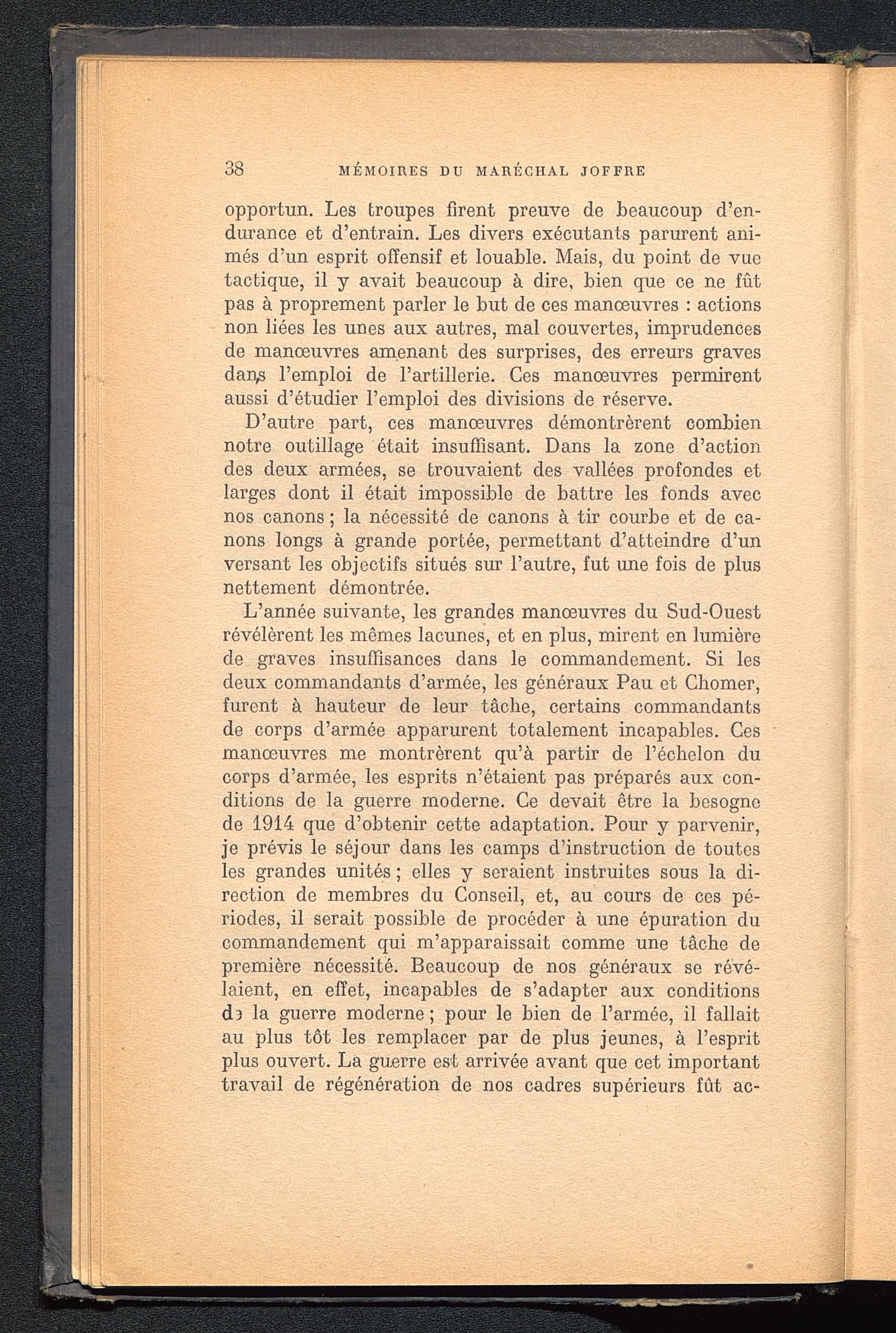 L’année suivante, les grandes manœuvres du Sud-Ouestrévélèrent les mêmes lacunes, et en plus, mirent en lumièrede graves insuffisances dans le commandement. Si lesdeux commandants d’armée, les généraux Pau et Chômer,furent à hauteur de leur tâche, certains commandantsde corps d’armée apparurent totalement incapables. Cesmanœuvres me montrèrent qu’à partir de l’échelon ducorps d’armée, les esprits n’étaient pas préparés aux con-ditions de la guerre moderne. Ce devait être la besognede 1914 que d’obtenir cette adaptation. Pour y parvenir,je prévis le séjour dans les camps d’instruction de toutesles grandes unités ; elles y seraient instruites sous la di-rection de membres du Conseil, et, au cours de ces pé-riodes, il serait possible de procéder à une épuration ducommandement qui m’apparaissait comme une tâche depremière nécessité. Beaucoup de nos généraux se révé-laient, en effet, incapables de s’adapter aux conditionsdî la guerre moderne ; pour le bien de l’armée, il fallaitau plus tôt les remplacer par de plus jeunes, à l’espritplus ouvert. La guerre est arrivée avant que cet importanttravail de régénération de nos cadres supérieurs fût ac-
