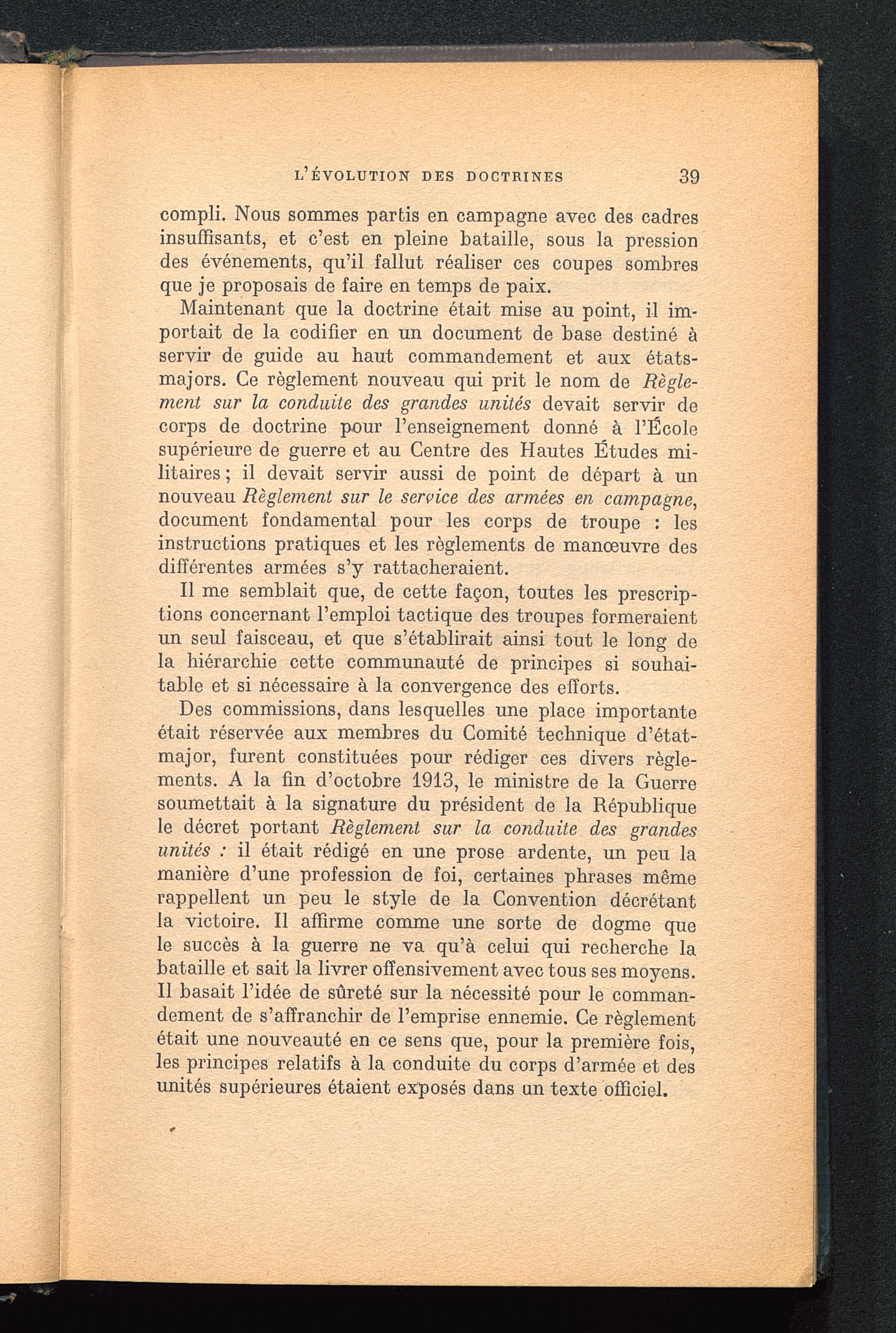 Il me semblait que, de cette façon, toutes les prescrip-tions concernant l’emploi tactique des troupes formeraientun seul faisceau, et que s’établirait ainsi tout le long dela hiérarchie cette communauté de principes si souhai-table et si nécessaire à la convergence des efforts.
