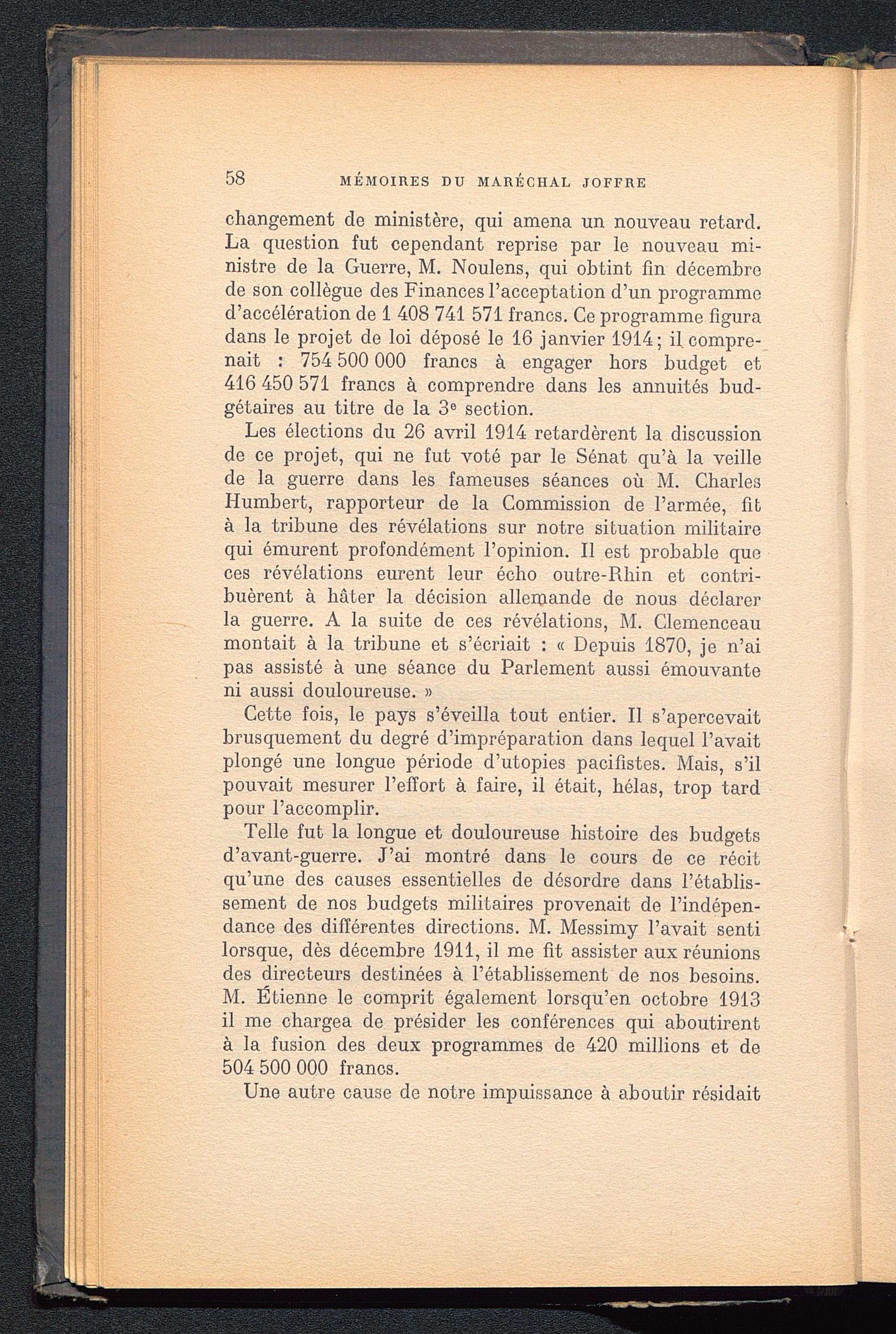 Telle fut la longue et douloureuse histoire des budgetsd’avant-guerre. J’ai montré dans le cours de ce récitqu’une des causes essentielles de désordre dans l’établis-sement de nos budgets militaires provenait de l’indépen-dance des différentes directions. M. Messimy l’avait sentilorsque, dès décembre 1911, il me fit assister aux réunionsdes directeurs destinées à l’établissement de nos besoins.M. Étienne le comprit également lorsqu’en octobre 1913il me chargea de présider les conférences qui aboutirentà la fusion des deux programmes de 420 millions et de504 500 000 francs.