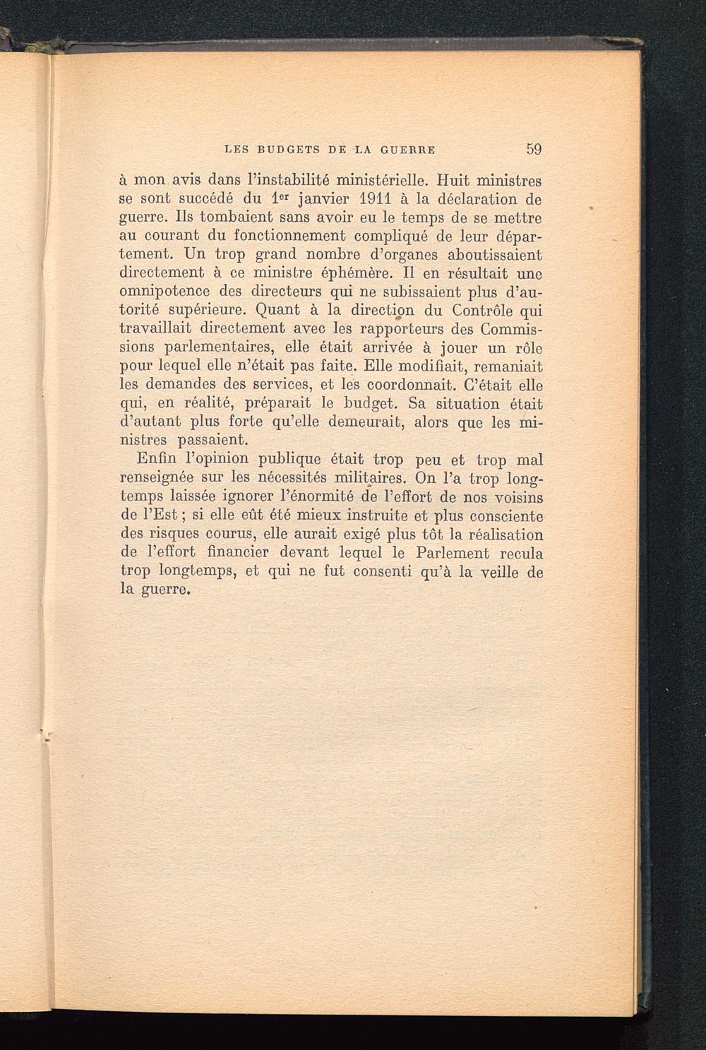 à mon avis dans l’instabilité ministérielle. Huit ministresse sont succédé du 1 er janvier 1911 à la déclaration deguerre. Ils tombaient sans avoir eu le temps de se mettreau courant du fonctionnement compliqué de leur dépar-tement. Un trop grand nombre d’organes aboutissaientdirectement à ce ministre éphémère. Il en résultait uneomnipotence des directeurs qui ne subissaient plus d’au-torité supérieure. Quant à la direction du Contrôle quitravaillait directement avec les rapporteurs des Commis-sions parlementaires, elle était arrivée à jouer un rôlepour lequel elle n’était pas faite. Elle modifiait, remaniaitles demandes des services, et les coordonnait. C’était ellequi, en réalité, préparait le budget. Sa situation étaitd’autant plus forte qu’elle demeurait, alors que les mi-nistres passaient.