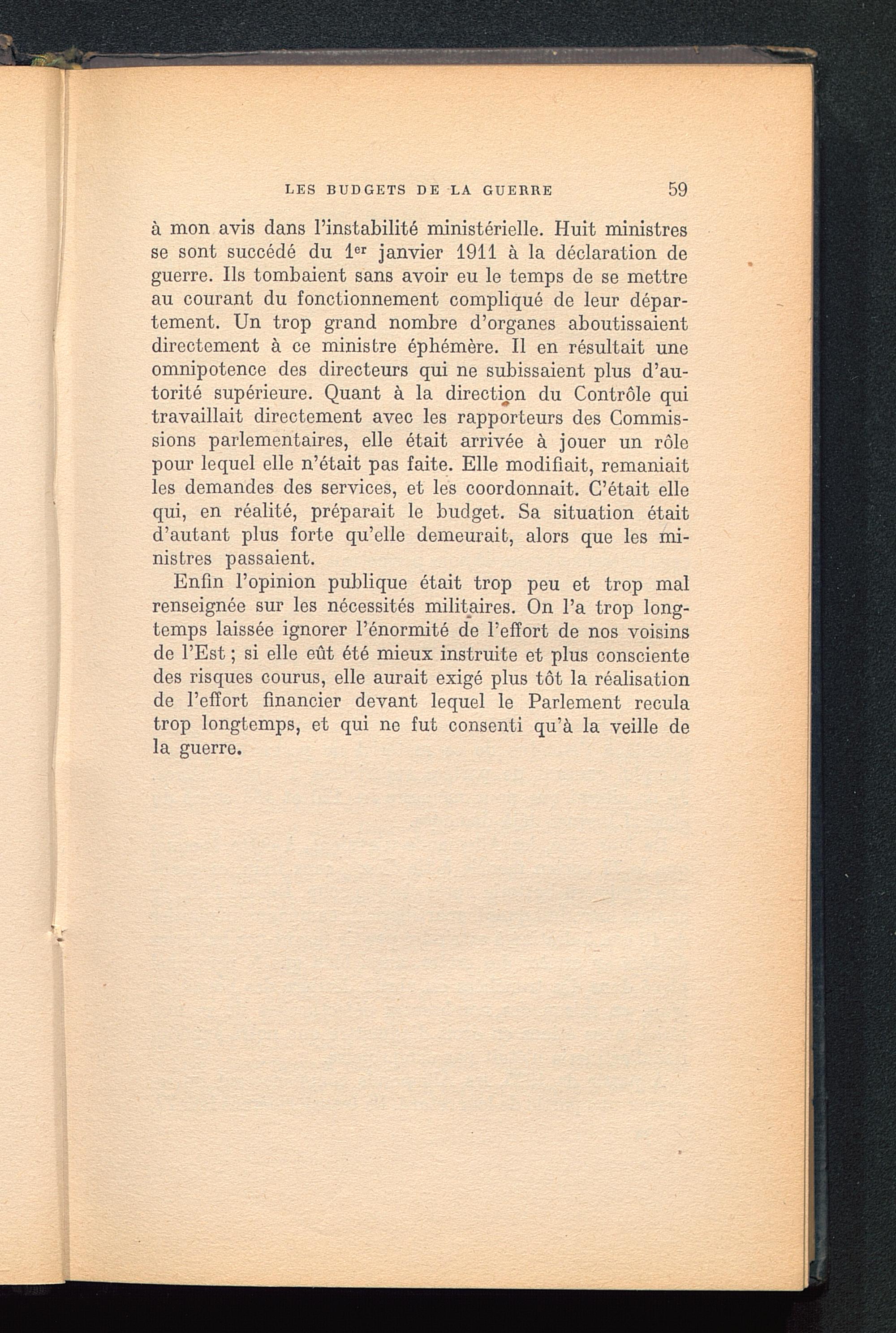 Enfin l’opinion publique était trop peu et trop malrenseignée sur les nécessités militaires. On l’a trop long-temps laissée ignorer l’énormité de l’effort de nos voisinsde l’Est ; si elle eût été mieux instruite et plus conscientedes risques courus, elle aurait exigé plus tôt la réalisationde l’effort financier devant lequel le Parlement reculatrop longtemps, et qui ne fut consenti qu’à la veille dela guerre.
