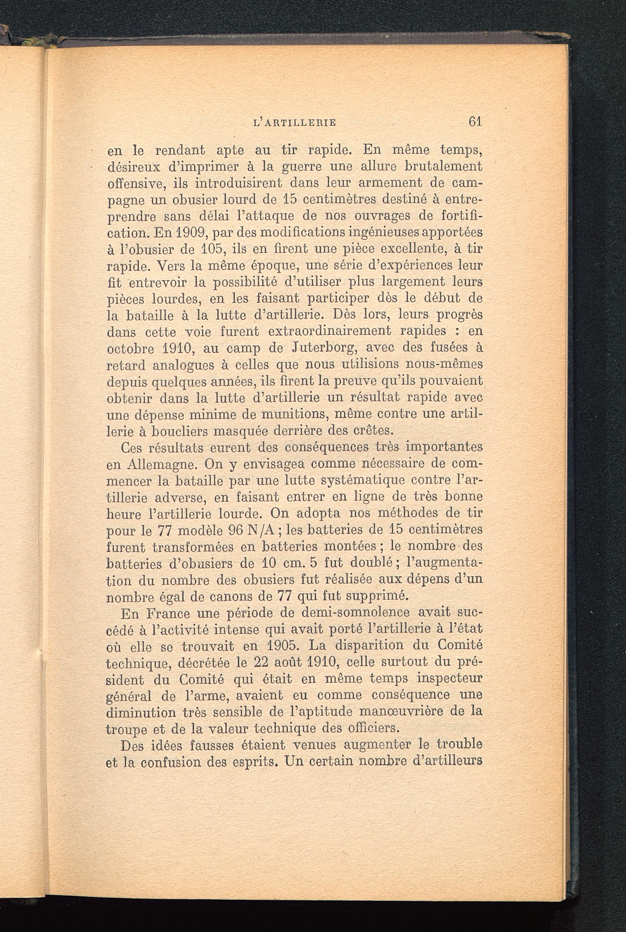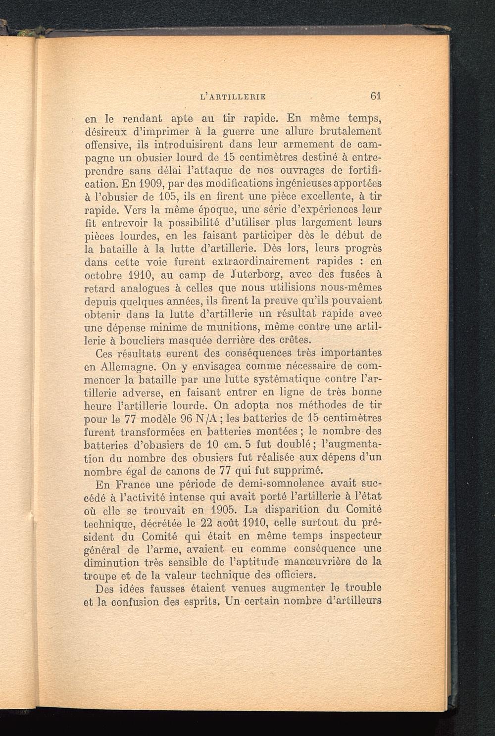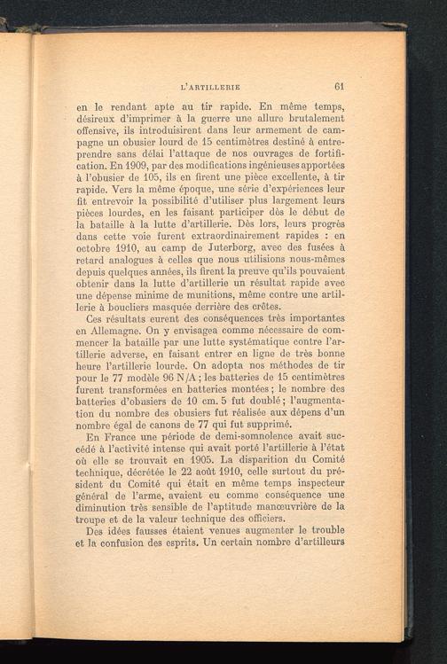 En France une période de demi-somnolence avait suc-cédé à l’activité intense qui avait porté l’artillerie à l’étatoù elle se trouvait en 1905. La disparition du Comitétechnique, décrétée le 22 août 1910, celle surtout du pré-sident du Comité qui était en même temps inspecteurgénéral de l’arme, avaient eu comme conséquence unediminution très sensible de l’aptitude manœuvrière de latroupe et de la valeur technique des officiers.