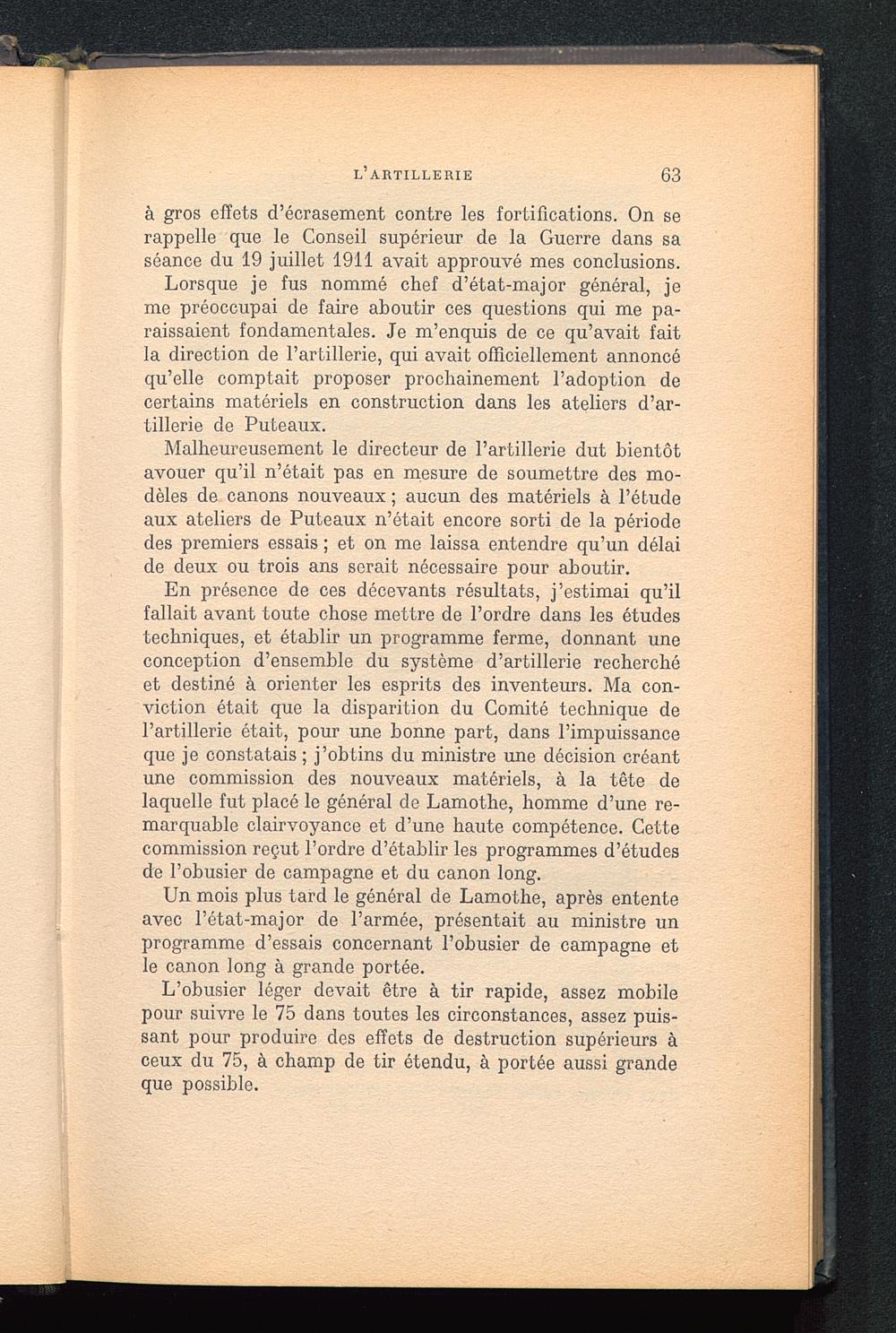 Un mois plus tard le général de Lamothe, après ententeavec l’état-major de l’armée, présentait au ministre unprogramme d’essais concernant l’obusier de campagne etle canon long à grande portée.