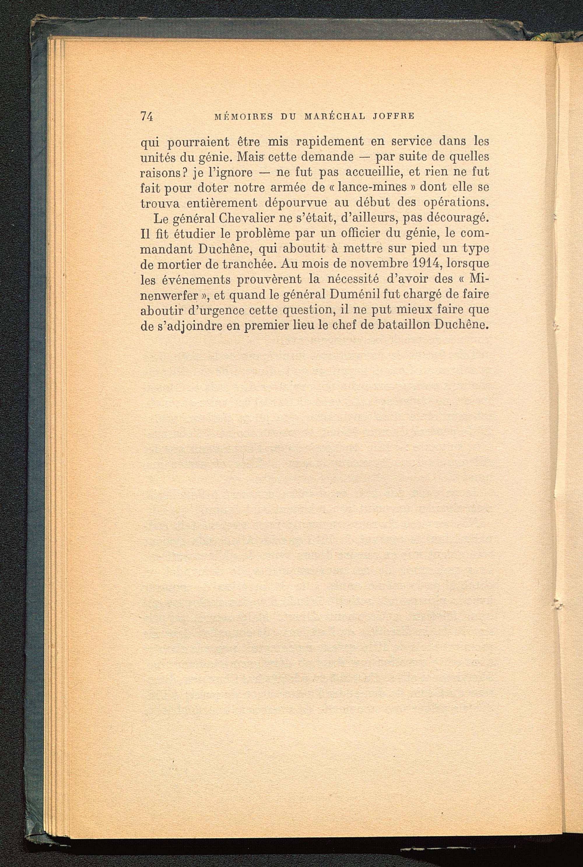 Le général Chevalier ne s’était, d’ailleurs, pas découragé.Il fit étudier le problème par un officier du génie, le com-mandant Duchêne, qui aboutit à mettre sur pied un typede mortier de tranchée. Au mois de novembre 1914, lorsqueles événements prouvèrent la nécessité d’avoir des « Mi-nenwerfer », et quand le général Duménil fut chargé de faireaboutir d’urgence cette question, il ne put mieux faire quede s’adjoindre en premier lieu le chef de bataillon Duchêne.