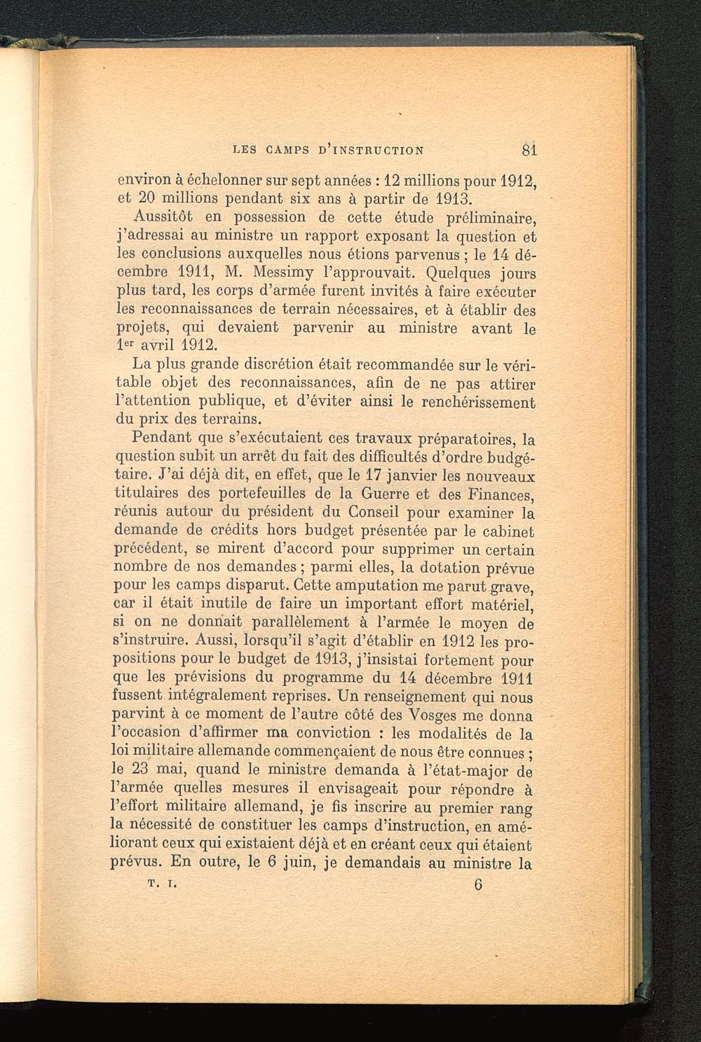 Pendant que s’exécutaient ces travaux préparatoires, laquestion subit un arrêt du fait des difficultés d’ordre budgé-taire. J’ai déjà dit, en effet, que le 17 janvier les nouveauxtitulaires des portefeuilles de la Guerre et des Finances,réunis autour du président du Conseil pour examiner lademande de crédits hors budget présentée par le cabinetprécédent, se mirent d’accord pour supprimer un certainnombre de nos demandes ; parmi elles, la dotation prévuepour les camps disparut. Cette amputation me parut grave,car il était inutile de faire un important effort matériel,si on ne donnait parallèlement à l’armée le moyen des’instruire. Aussi, lorsqu’il s’agit d’établir en 1912 les pro-positions pour le budget de 1913, j’insistai fortement pourque les prévisions du programme du 14 décembre 1911fussent intégralement reprises. Un renseignement qui nousparvint à ce moment de l’autre côté des Vosges me donnal’occasion d’affirmer ma conviction : les modalités de laloi militaire allemande commençaient de nous être connues ;le 23 mai, quand le ministre demanda à l’état-major del’armée quelles mesures il envisageait pour répondre àl’effort militaire allemand, je fis inscrire au premier rangla nécessité de constituer les camps d’instruction, en amé-liorant ceux qui existaient déjà et en créant ceux qui étaientprévus. En outre, le 6 juin, je demandais au ministre la