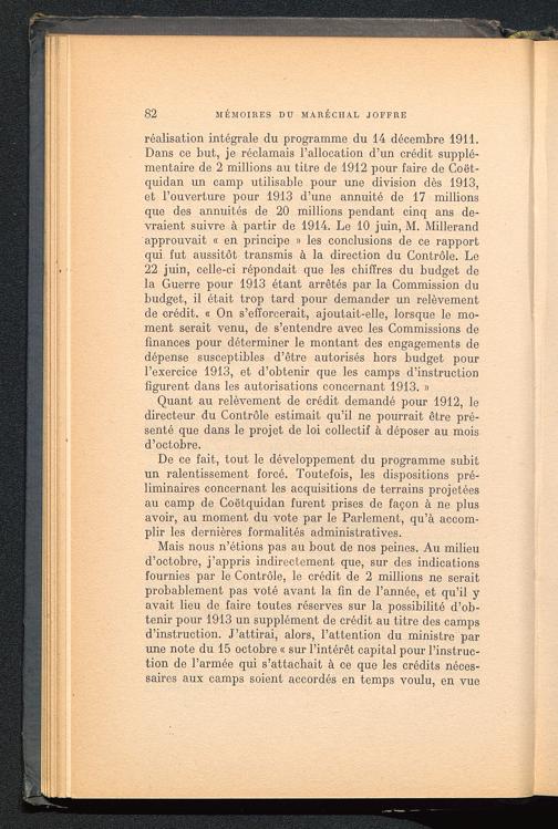 Mais nous n’étions pas au bout de nos peines. Au milieud’octobre, j’appris indirectement que, sur des indicationsfournies par le Contrôle, le crédit de 2 millions ne seraitprobablement pas voté avant la fin de l’année, et qu’il yavait lieu de faire toutes réserves sur la possibilité d’ob-tenir pour 1913 un supplément de crédit au titre des campsd’instruction. J’attirai, alors, l’attention du ministre parune note du 15 octobre « sur l’intérêt capital pour l’instruc-tion de l’armée qui s’attachait à ce que les crédits néces-saires aux camps soient accordés en temps voulu, en vue