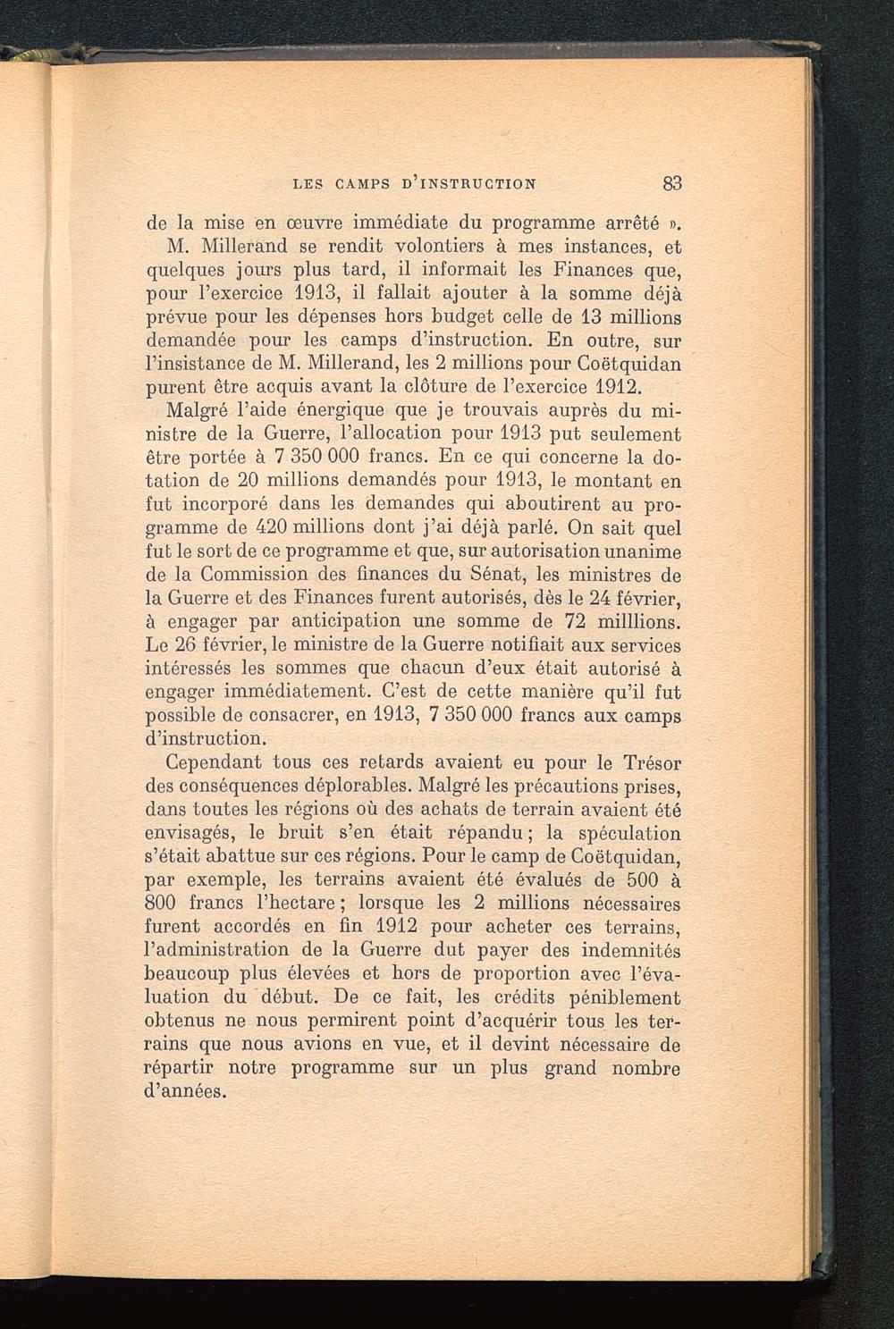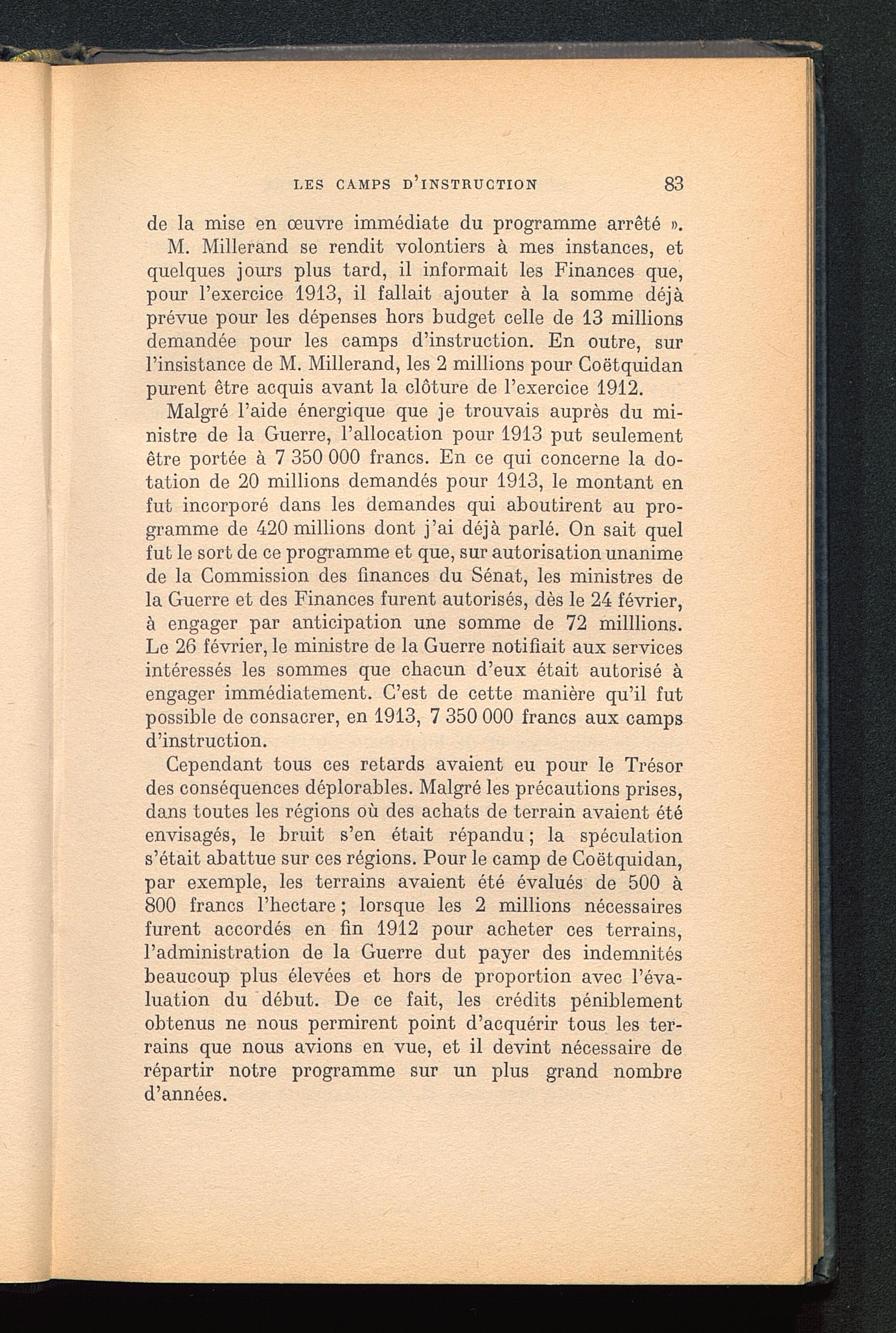 M. Millerand se rendit volontiers à mes instances, etquelques jours plus tard, il informait les Finances que,pour l’exercice 1913, il fallait ajouter à la somme déjàprévue pour les dépenses hors budget celle de 13 millionsdemandée pour les camps d’instruction. En outre, surl’insistance de M. Millerand, les 2 millions pour Coëtquidanpurent être acquis avant la clôture de l’exercice 1912.