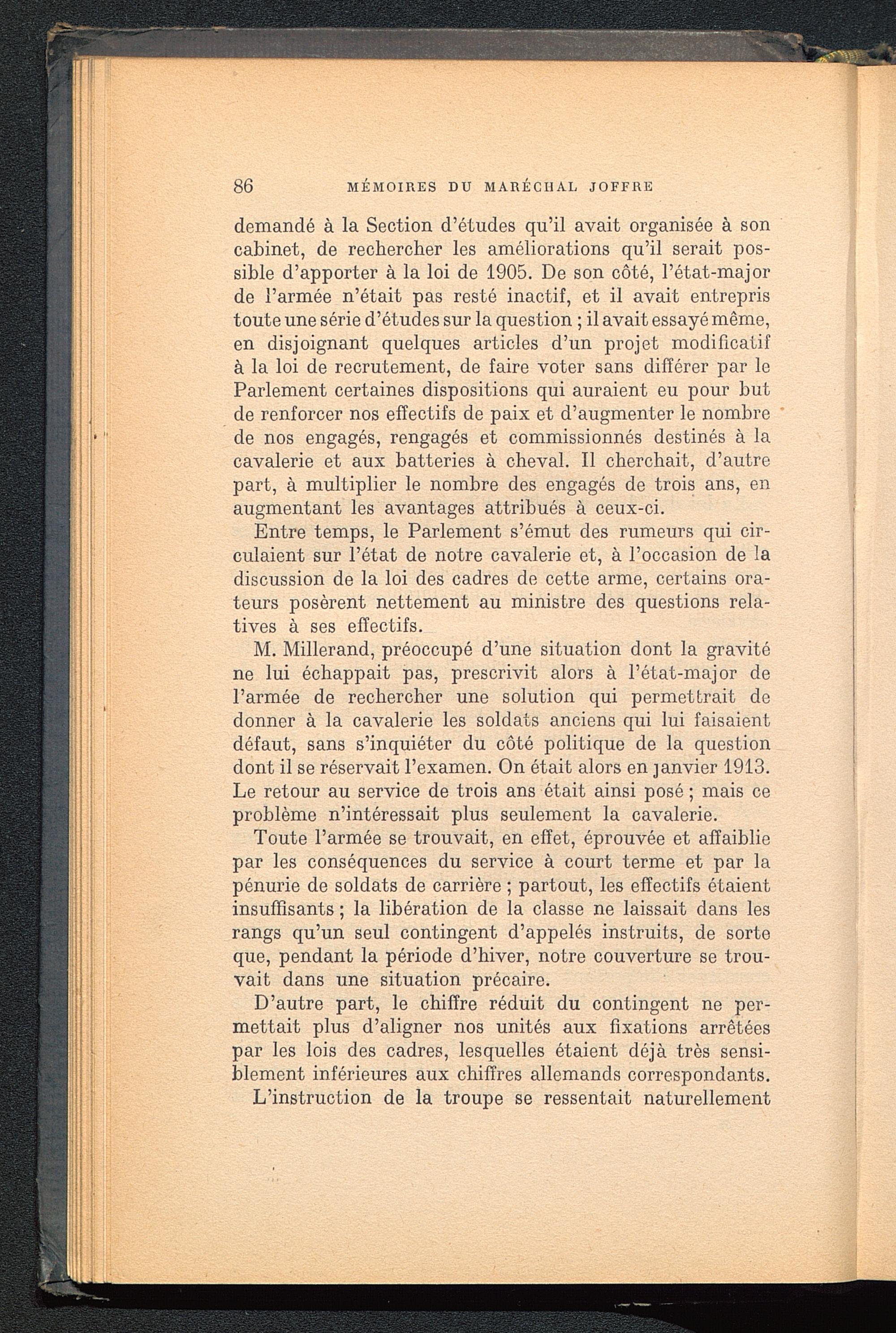 M. Millerand, préoccupé d’une situation dont la graviténe lui échappait pas, prescrivit alors à l’état-major del’armée de rechercher une solution qui permettrait dedonner à la cavalerie les soldats anciens qui lui faisaientdéfaut, sans s’inquiéter du côté politique de la questiondont il se réservait l’examen. On était alors en janvier 1913.Le retour au service de trois ans était ainsi posé ; mais ceproblème n’intéressait plus seulement la cavalerie.