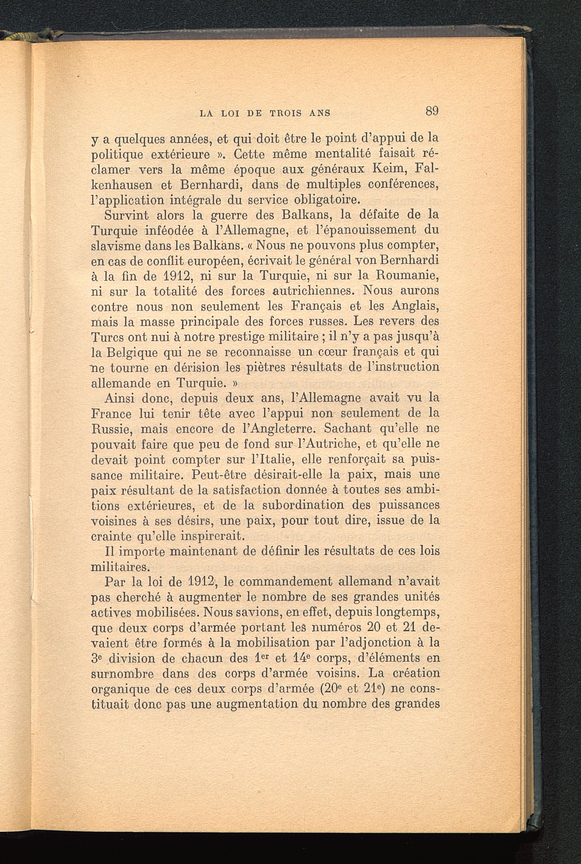 Survint alors la guerre des Balkans , la défaite de laTurquie inféodée à l’Allemagne , et l’épanouissement duslavisme dans les Balkans . « Nous ne pouvons plus compter,en cas de conflit européen, écrivait le général von Bernhardià la fin de 1912, ni sur la Turquie, ni sur la Roumanie ,ni sur la totalité des forces autrichiennes. Nous auronscontre nous non seulement les Français et les Anglais ,mais la masse principale des forces russes. Les revers desTurcs ont nui à notre prestige militaire ; il n’y a pas jusqu’àla Belgique qui ne se reconnaisse un cœur français et quine tourne en dérision les piètres résultats de l’instructionallemande en Turquie . »