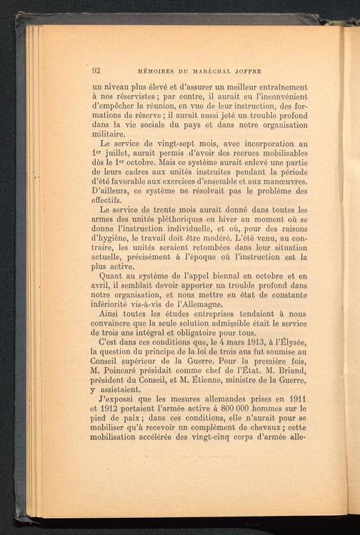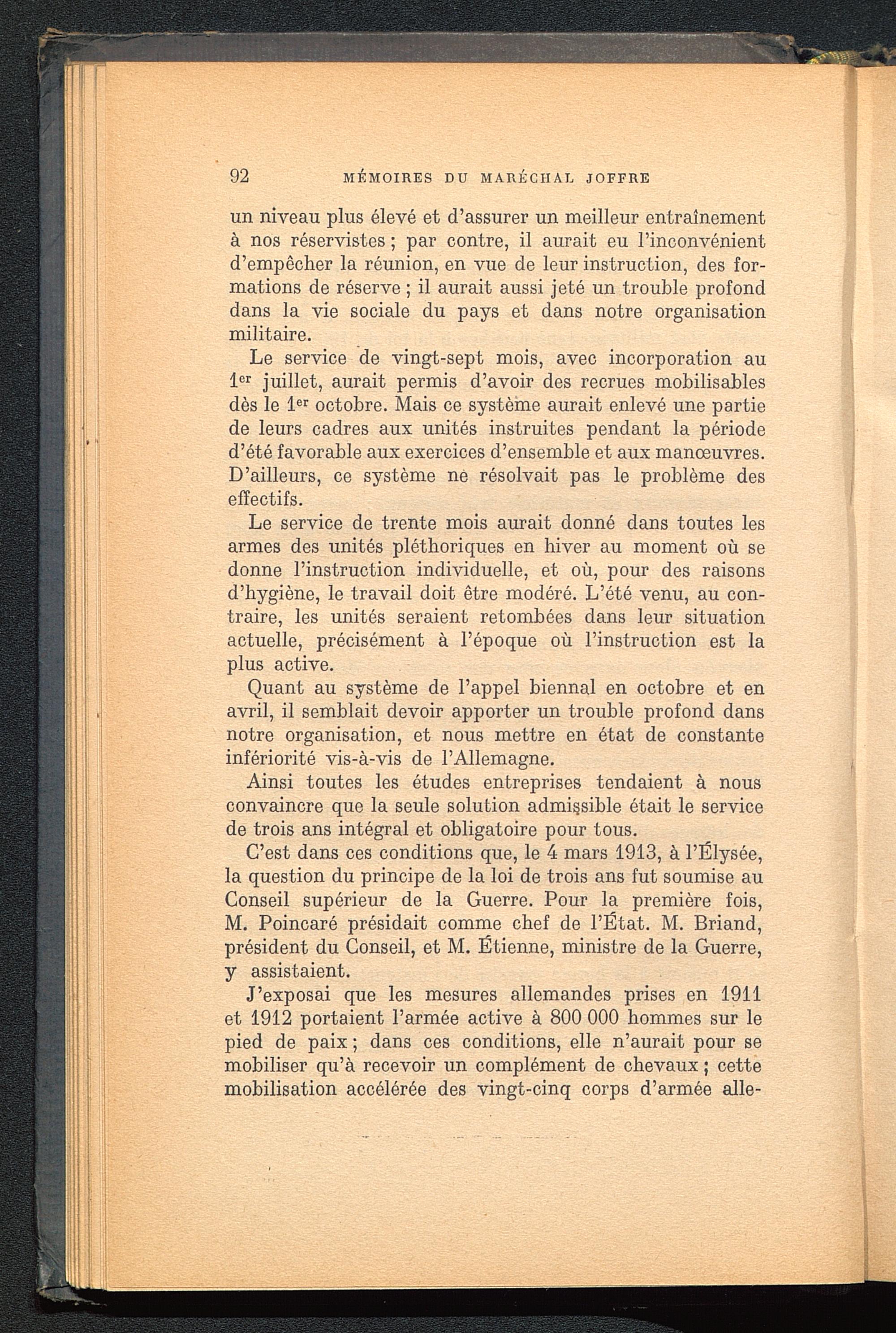 C’est dans ces conditions que, le 4 mars 1913, à l’Ëlysée, la question du principe de la loi de trois ans fut soumise auConseil supérieur de la Guerre. Pour la première fois,M. Poincaré présidait comme chef de l’État. M. Briand,président du Conseil, et M. Étienne, ministre de la Guerre,y assistaient.