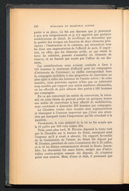 Trois jours plus tard, M. Étienne déposait le texte votépar la Chambre sur le bureau du Sénat , marquant ainsil’urgence qu’il y avait à aboutir. Un rapport favorablede la Commission de l’armée du Sénat fut déposé parM. Doumer, président de cette Commission dès le 25 juillet,et le 31 les débats commençaient devant la Haute Assem-blée. La discussion fut assez brève, malgré que d’inévi-tables contre-projets eussent été déposés. Je n’assistaipoint aux séances. Mais, d’ores et déjà, il paraissait que