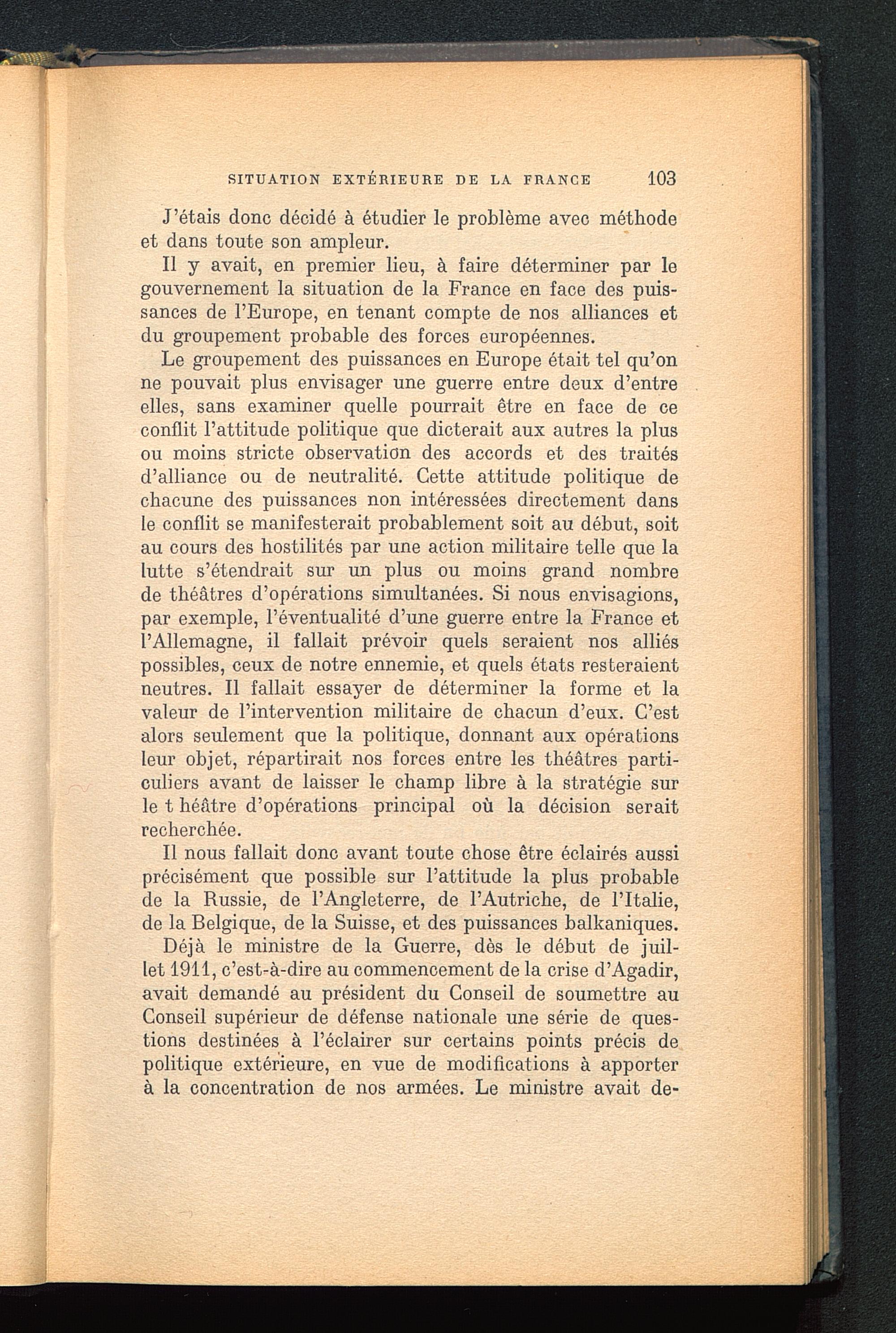 Déjà le ministre de la Guerre, dès le début de juil-let 1911, c’est-à-dire au commencement de la crise d’Agadir ,avait demandé au président du Conseil de soumettre auConseil supérieur de défense nationale une série de ques-tions destinées à l’éclairer sur certains points précis depolitique extérieure, en vue de modifications à apporterà la concentration de nos armées. Le ministre avait de-