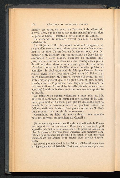 Le ministre se rangea volontiers à mon avis, et, à ladate du 28 septembre, il insista par écrit auprès de M. Cail-laux, président du Conseil, pour que les questions dont jevenais de parler fussent étudiées au prochain Conseil deDéfense nationale. Mais il n’eut pas de succès, et M. Cail-laux répondit par une fin de non-recevoir.