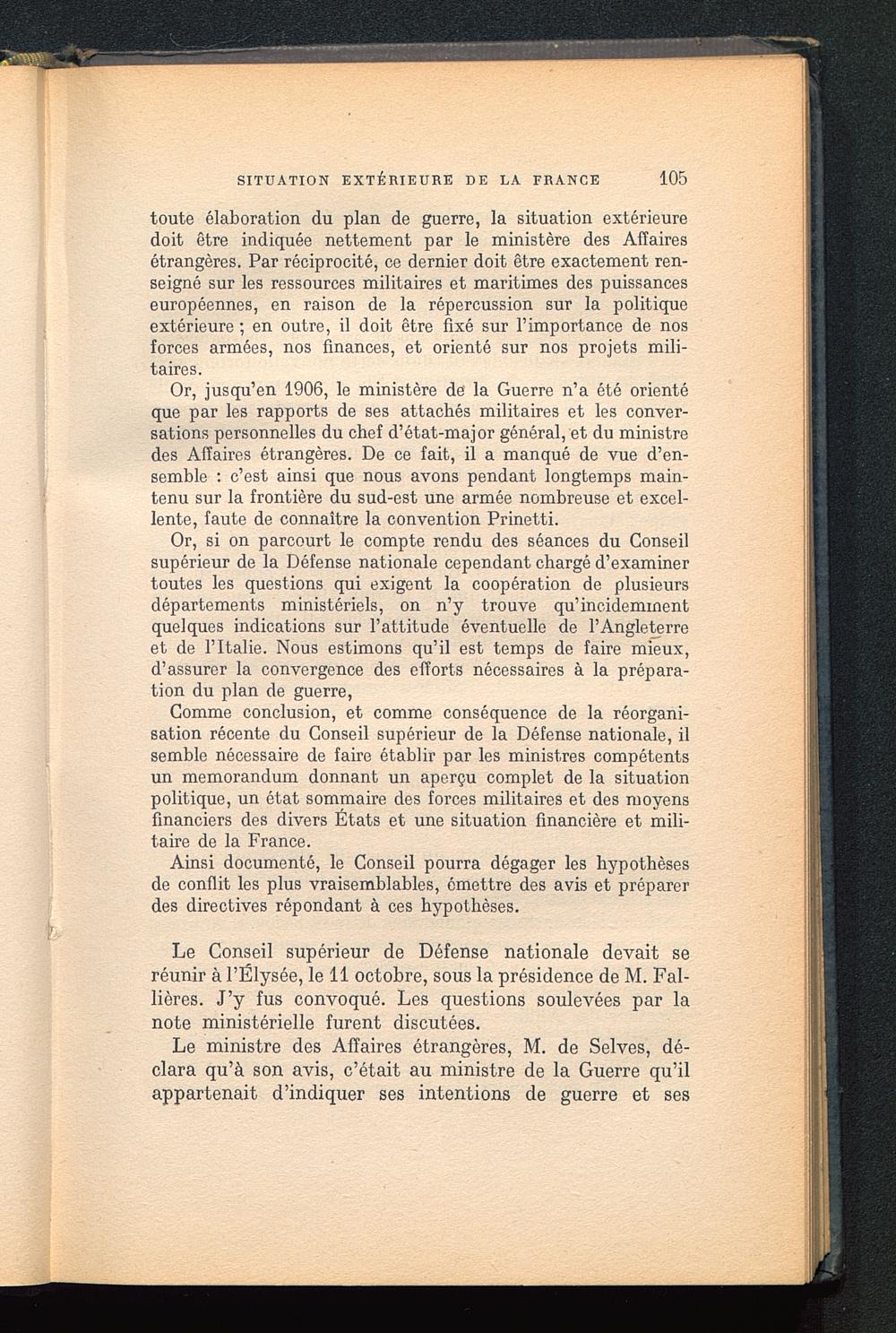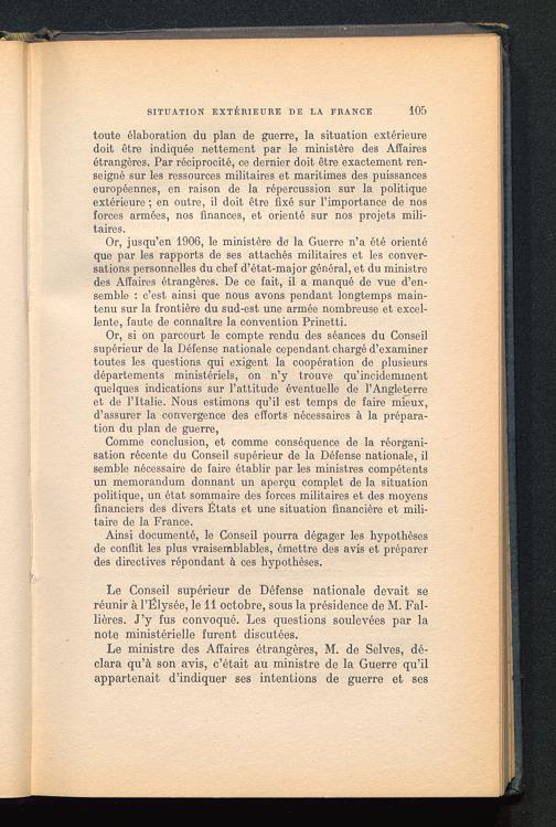 Le Conseil supérieur de Défense nationale devait seréunir à l’Ëlysée , le 11 octobre, sous la présidence de M. Fal-lières. J’y fus convoqué. Les questions soulevées par lanote ministérielle furent discutées.