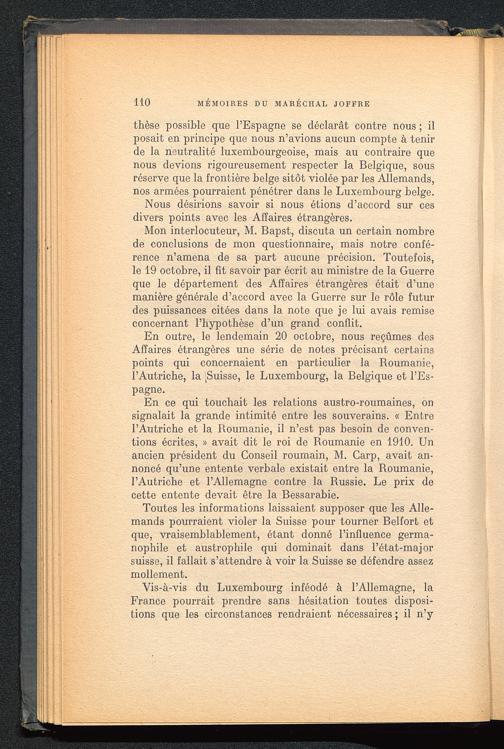 thèse possible que l’Espagne se déclarât contre nous ; ilposait en principe que nous n’avions aucun compte à tenirde la neutralité luxembourgeoise, mais au contraire quenous devions rigoureusement respecter la Belgique , sousréserve que la frontière belge sitôt violée par les Allemands,nos armées pourraient pénétrer dans le Luxembourg belge.
