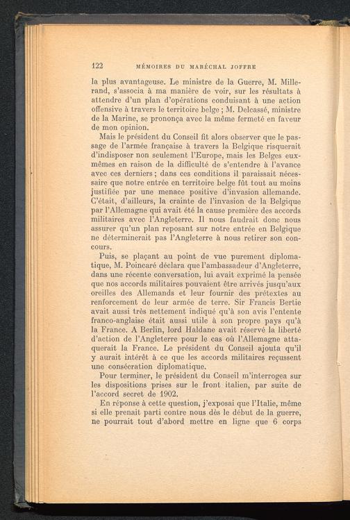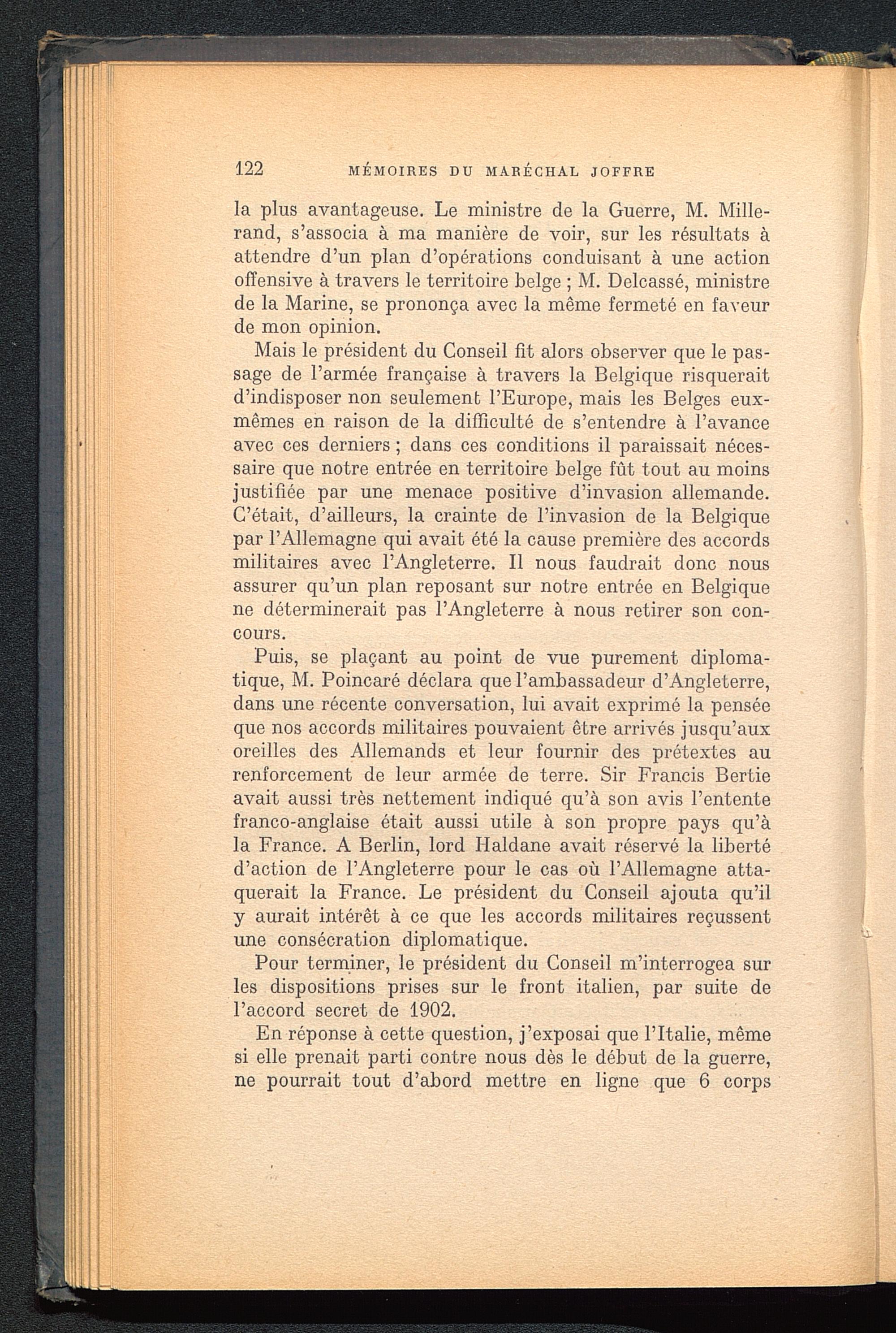 Mais le président du Conseil fit alors observer que le pas-sage de l’armée française à travers la Belgique risqueraitd’indisposer non seulement l’Europe , mais les Belges eux-mêmes en raison de la difficulté de s’entendre à l’avanceavec ces derniers ; dans ces conditions il paraissait néces-saire que notre entrée en territoire belge fût tout au moinsjustifiée par une menace positive d’invasion allemande.C’était, d’ailleurs, la crainte de l’invasion de la Belgique par l’Allemagne qui avait été la cause première des accordsmilitaires avec l’Angleterre . Il nous faudrait donc nousassurer qu’un plan reposant sur notre entrée en Belgique ne déterminerait pas l’Angleterre à nous retirer son con-cours.