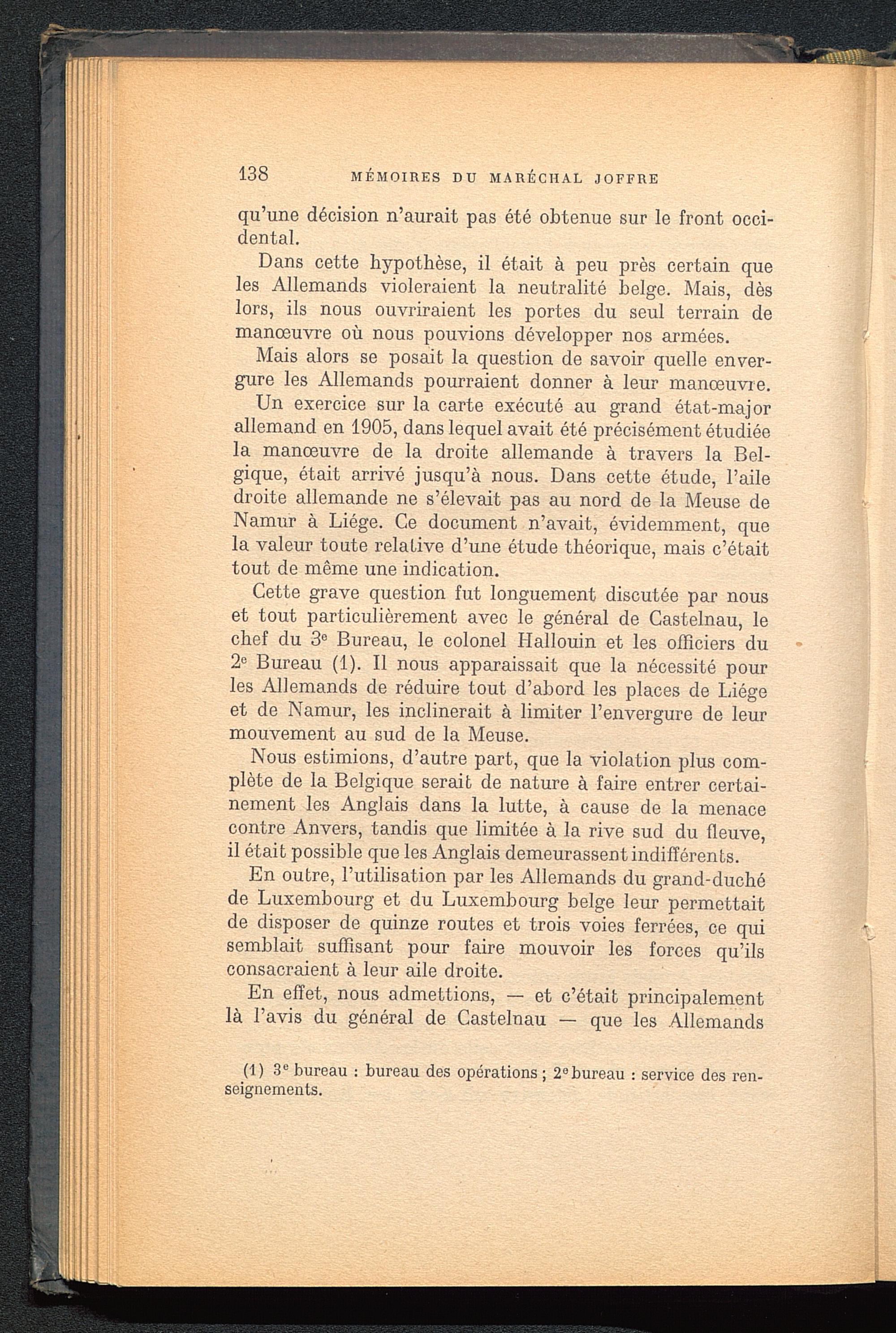 Cette grave question fut longuement discutée par nouset tout particulièrement avec le général de Castelnau, lechef du 3 e Bureau, le colonel Hallouin et les officiers du2° Bureau (1). Il nous apparaissait que la nécessité pourles Allemands de réduire tout d’abord les places de Liège et de Namur, les inclinerait à limiter l’envergure de leurmouvement au sud de la Meuse.