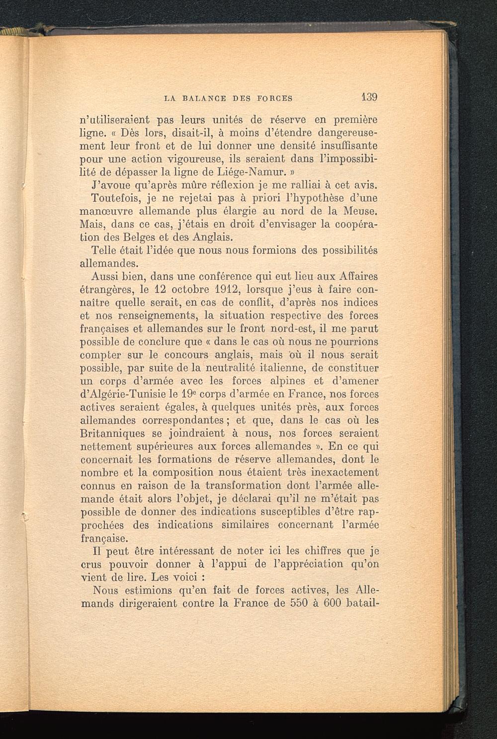 Aussi bien, dans une conférence qui eut lieu aux Affairesétrangères, le 12 octobre 1912, lorsque j’eus à faire con-naître quelle serait, en cas de conflit, d’après nos indiceset nos renseignements, la situation respective des forcesfrançaises et allemandes sur le front nord-est, il me parutpossible de conclure que « dans le cas où nous ne pourrionscompter sur le concours anglais , mais où il nous seraitpossible, par suite de la neutralité italienne, de constituerun corps d’armée avec les forces alpines et d’amenerd’Algérie-Tunisie le 19 e corps d’armée en France, nos forcesactives seraient égales, à quelques unités près, aux forcesallemandes correspondantes ; et que, dans le cas où lesBritanniques se joindraient à nous, nos forces seraientnettement supérieures aux forces allemandes ». En ce quiconcernait les formations de réserve allemandes, dont lenombre et la composition nous étaient très inexactementconnus en raison de la transformation dont l’armée alle-mande était alors l’objet, je déclarai qu’il ne m’était paspossible de donner des indications susceptibles d’être rap-prochées des indications similaires concernant l’arméefrançaise.
