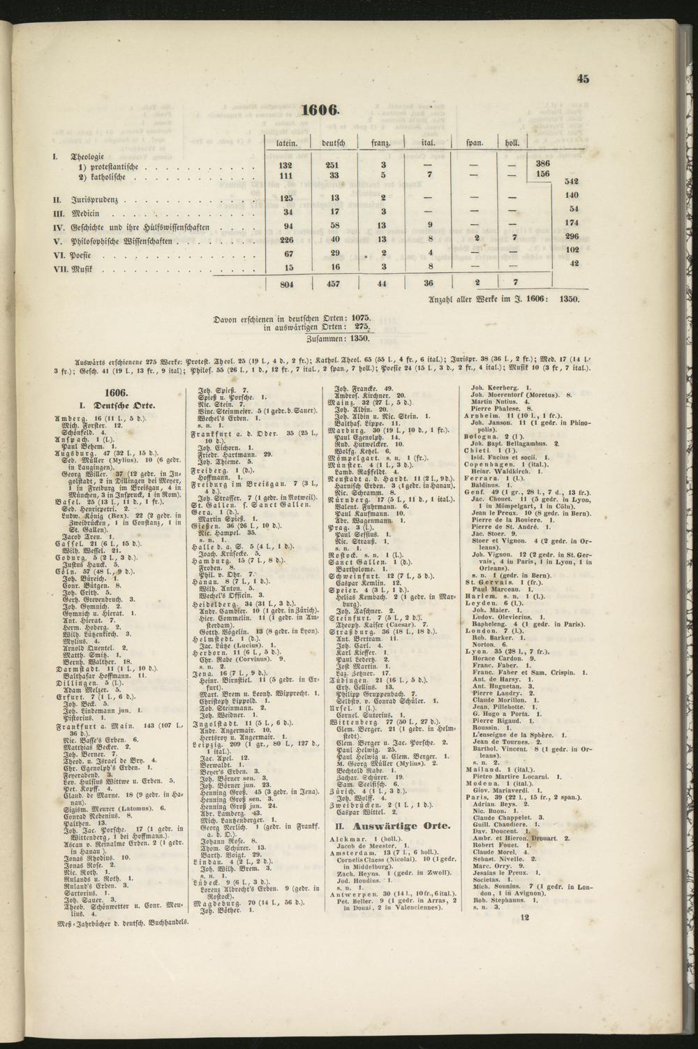 Auswärts erschienene 275 Werke: Protest. Theol, 25 (19 l., 4 d., S fr.); Kathol. Theol. 65 (55 l,, 4 fr., « ital.); Jurispr. 38 (3K l,, S fr.); Med. 17 (l4 1/3 fr); Gesch. 41 (lS l-, 13 fr., s ital ); Philos, 55 (26 l., i o., IS fr-, 7 ital., S span, 7 holl.); Poesie 24 (IS l-, 3 d., 2 fr., 4 ital.); Musik io (3 fr, 7 ital,).