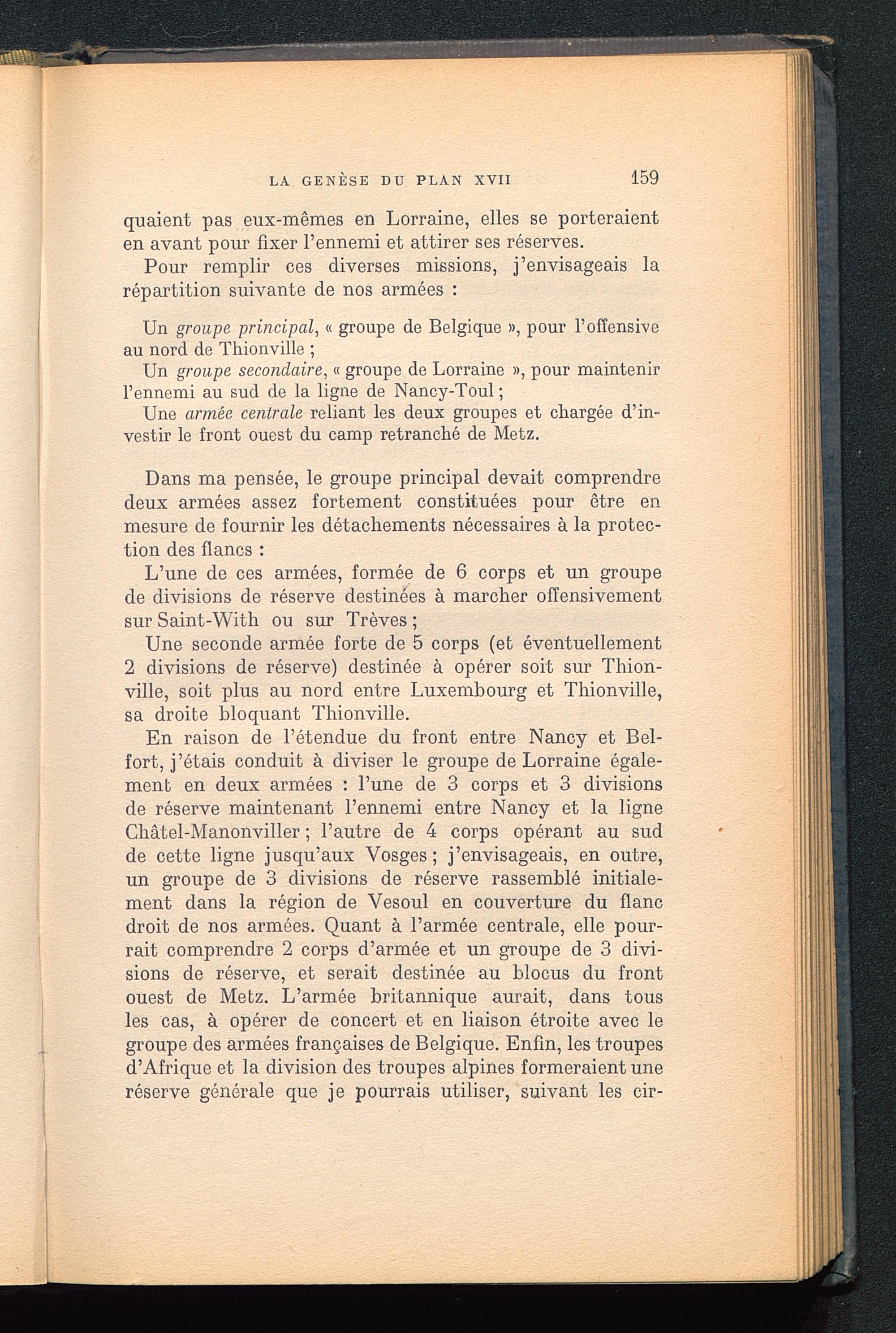 En raison de l’étendue du front entre Nancy et Bel-fort, j’étais conduit à diviser le groupe de Lorraine égale-ment en deux armées : l’une de 3 corps et 3 divisionsde réserve maintenant l’ennemi entre Nancy et la ligneChâtel-Manonviller ; l’autre de 4 corps opérant au sudde cette ligne jusqu’aux Vosges; j’envisageais, en outre,un groupe de 3 divisions de réserve rassemblé initiale-ment dans la région de Vesoul en couverture du flancdroit de nos armées. Quant à l’armée centrale, elle pour-rait comprendre 2 corps d’armée et un groupe de 3 divi-sions de réserve, et serait destinée au blocus du frontouest de Metz. L’armée britannique aurait, dans tousles cas, à opérer de concert et en liaison étroite avec legroupe des armées françaises de Belgique. Enfin, les troupesd’Afrique et la division des troupes alpines formeraient uneréserve générale que je pourrais utiliser, suivant les cir-