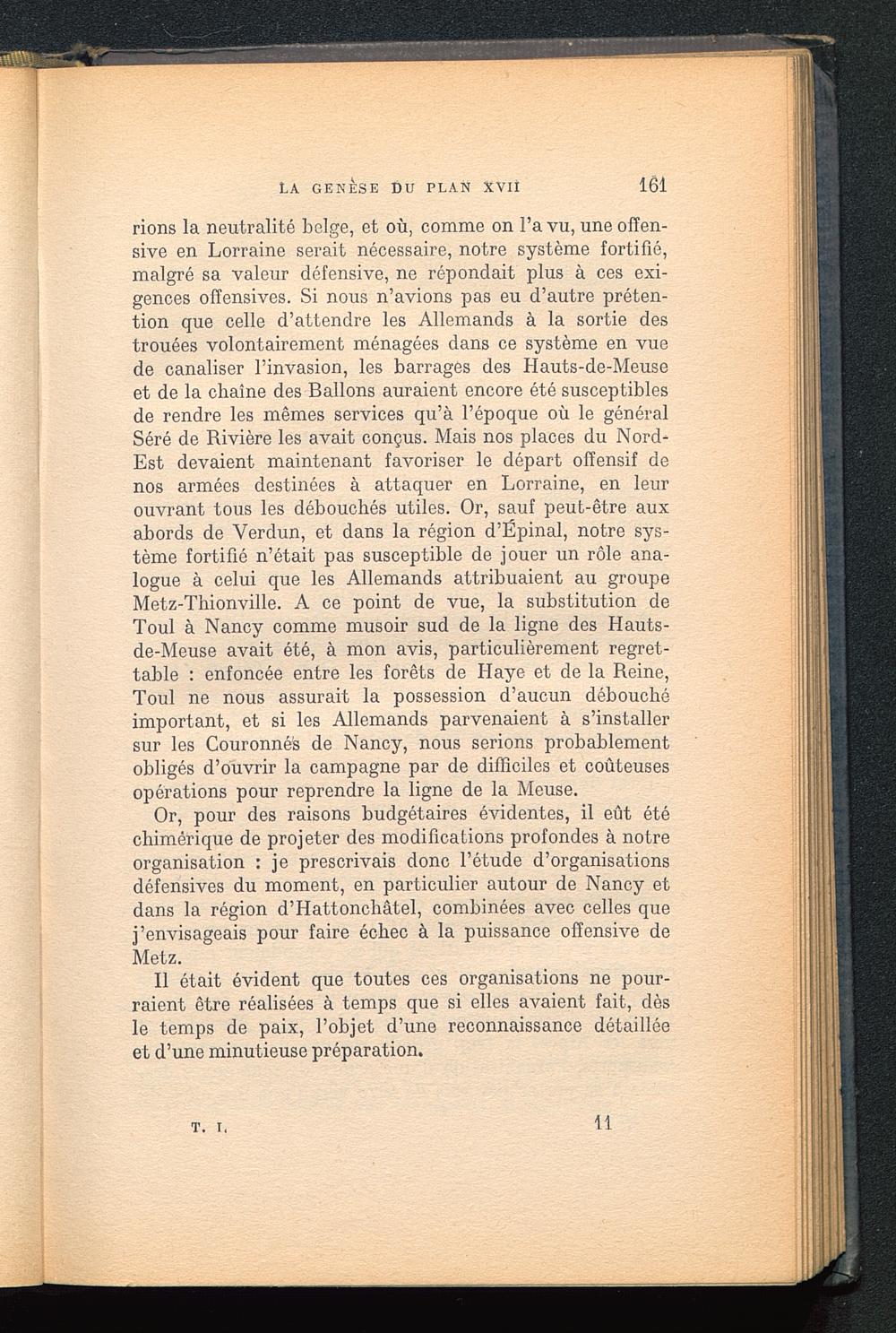 rions la neutralité belge , et où, comme on l’a vu, une offen-sive en Lorraine serait nécessaire, notre système fortifié,malgré sa valeur défensive, ne répondait plus à ces exi-gences offensives. Si nous n’avions pas eu d’autre préten-tion que celle d’attendre les Allemands à la sortie destrouées volontairement ménagées dans ce système en vuede canaliser l’invasion, les barrages des Hauts-de-Meuseet de la chaîne des Ballons auraient encore été susceptiblesde rendre les mêmes services qu’à l’époque où le généralSéré de Rivière les avait conçus. Mais nos places du Nord-Est devaient maintenant favoriser le départ offensif denos armées destinées à attaquer en Lorraine , en leurouvrant tous les débouchés utiles. Or, sauf peut-être auxabords de Verdun, et dans la région d’Ëpinal , notre sys-tème fortifié n’était pas susceptible de jouer un rôle ana-logue à celui que les Allemands attribuaient au groupeMetz-Thionville . A ce point de vue, la substitution deToul à Nancy comme musoir sud de la ligne des Hauts-de-Meuse avait été, à mon avis, particulièrement regret-table : enfoncée entre les forêts de Haye et de la Reine,Toul ne nous assurait la possession d’aucun débouchéimportant, et si les Allemands parvenaient à s’installersur les Couronnés de Nancy , nous serions probablementobligés d’ouvrir la campagne par de difficiles et coûteusesopérations pour reprendre la ligne de la Meuse .