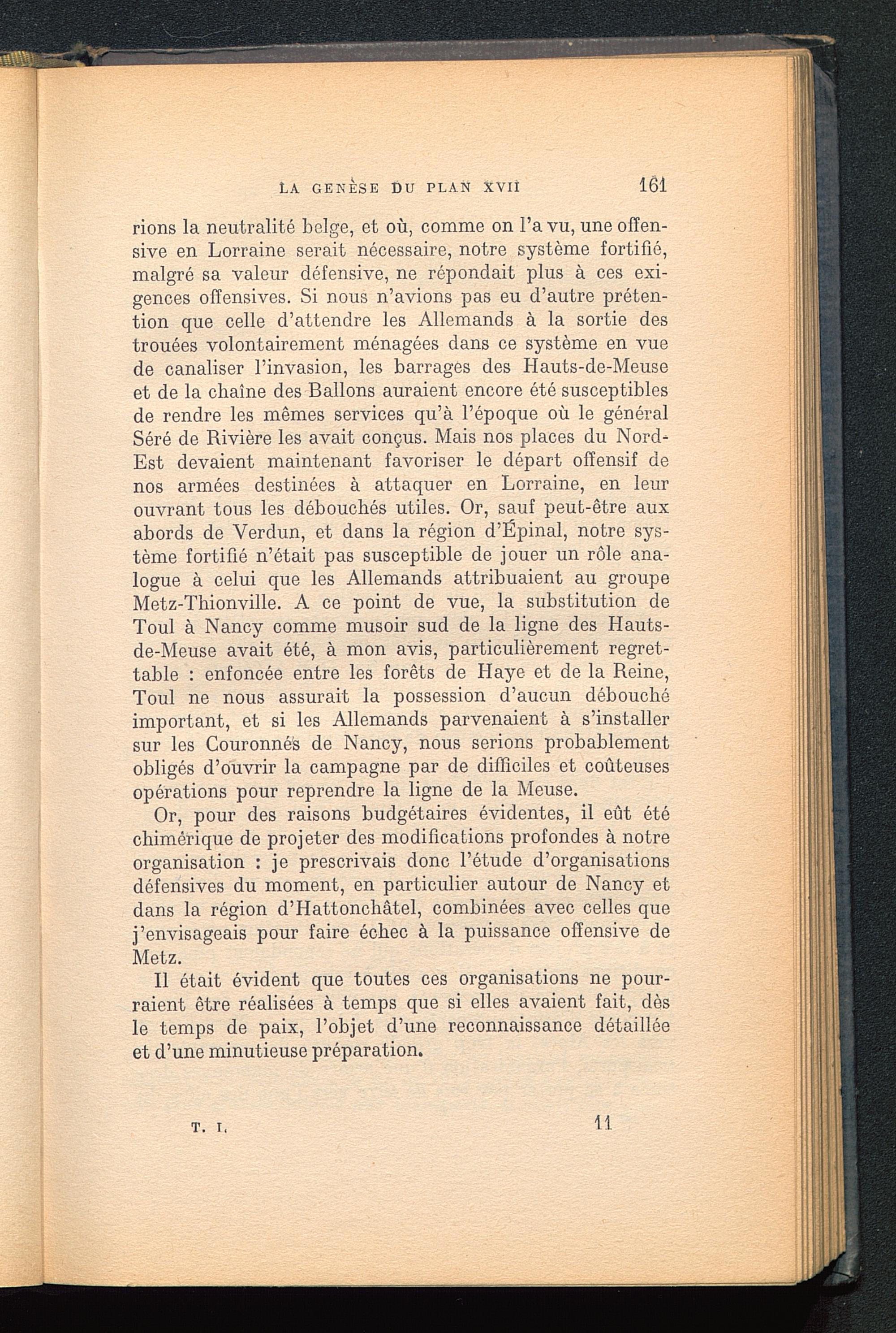Or, pour des raisons budgétaires évidentes, il eût étéchimérique de projeter des modifications profondes à notreorganisation : je prescrivais donc l’étude d’organisationsdéfensives du moment, en particulier autour de Nancy etdans la région d’Hattonchâtel, combinées avec celles quej’envisageais pour faire échec à la puissance offensive deMetz .