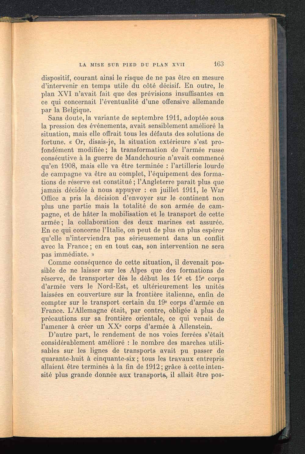Sans doute, la variante de septembre 1911, adoptée sousla pression des événements, avait sensiblement amélioré lasituation, mais elle offrait tous les défauts des solutions defortune. « Or, disais-je, la situation extérieure s’est pro-fondément modifiée ; la transformation de l’armée russeconsécutive à la guerre de Mandchourie n’avait commencéqu’en 1908, mais elle va être terminée : l’artillerie lourdede campagne va être au complet, l’équipement des forma-tions de réserve est constitué ; l’Angleterre paraît plus quejamais décidée à nous appuyer : en juillet 1911, le WarOffice a pris la décision d’envoyer sur le continent nonplus une partie mais la totalité de son armée de cam-pagne, et de hâter la mobilisation et le transport de cettearmée ; la collaboration des deux marines est assurée.En ce qui concerne l’Italie , on peut de plus en plus espérerqu’elle n’interviendra pas sérieusement dans un conflitavec la France ; en en tout cas, son intervention ne serapas immédiate. »