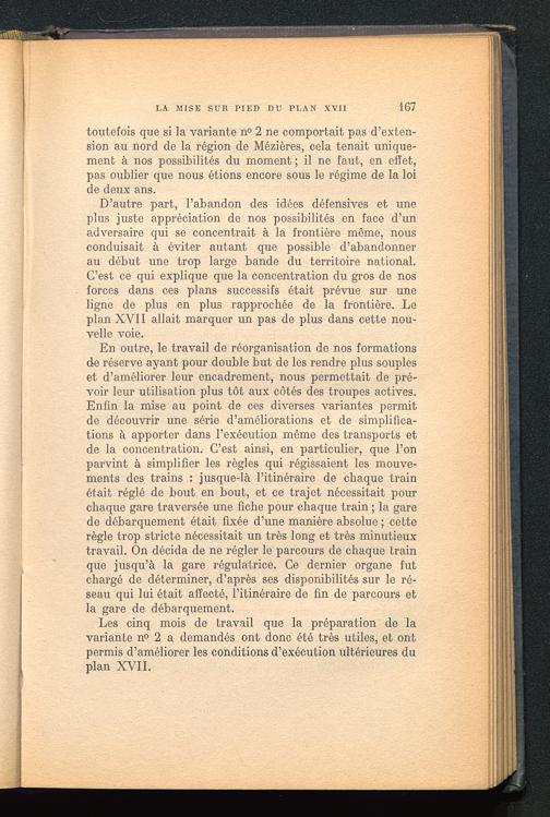 D’autre part, l’abandon des idées défensives et uneplus juste appréciation de nos possibilités en face d’unadversaire qui se concentrait à la frontière même, nousconduisait à éviter autant que possible d’abandonnerau début une trop large bande du territoire national.C’est ce qui explique que la concentration du gros de nosforces dans ces plans successifs était prévue sur uneligne de plus en plus rapprochée de la frontière. Leplan XYII allait marquer un pas de plus dans cette nou-velle voie.