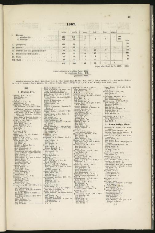 Auswärts erschienene 281 Werke: Prot. Thevl. 16 (14 l., 2 fr.); Kathol, Theol- 71 (KO l-, 7 fr., 3 ital-, I span.); Jurispr. 22 (l.); Med. 17 (l); Gesch. 61(34 t., II fr,, 14 ital., 2 span.); Philos. 64 (38 l., iv fr., 13 ital., 3 span.); Poesie 25 (17 l., 2 fr., 2 ital., 4 span.); Musik s (4 l., i fr.).