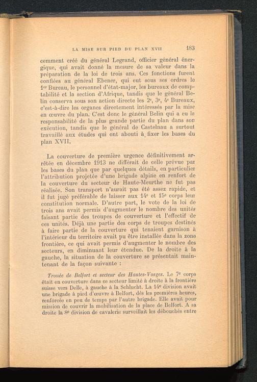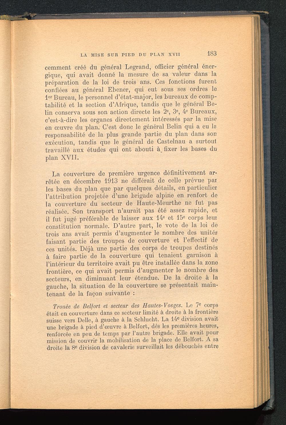 cemment créé du général Legrand, officier général éner-gique, qui avait donné la mesure de sa valeur dans lapréparation de la loi de trois ans. Ces fonctions furentconfiées au général Ebener, qui eut sous ses ordres le1 er Bureau, le personnel d’état-major, les bureaux de comp-tabilité et la section d’Afrique, tandis que le général Be-lin conserva sous son action directe les 2 e , 3 e , 4 e Bureaux,c’est-à-dire les organes directement intéressés par la miseen œuvre du plan. C’est donc le général Belin qui a eu laresponsabilité de la plus grande partie du plan dans sonexécution, tandis que le général de Castelnau a surtouttravaillé aux études qui ont abouti à fixer les bases duplan XVII.