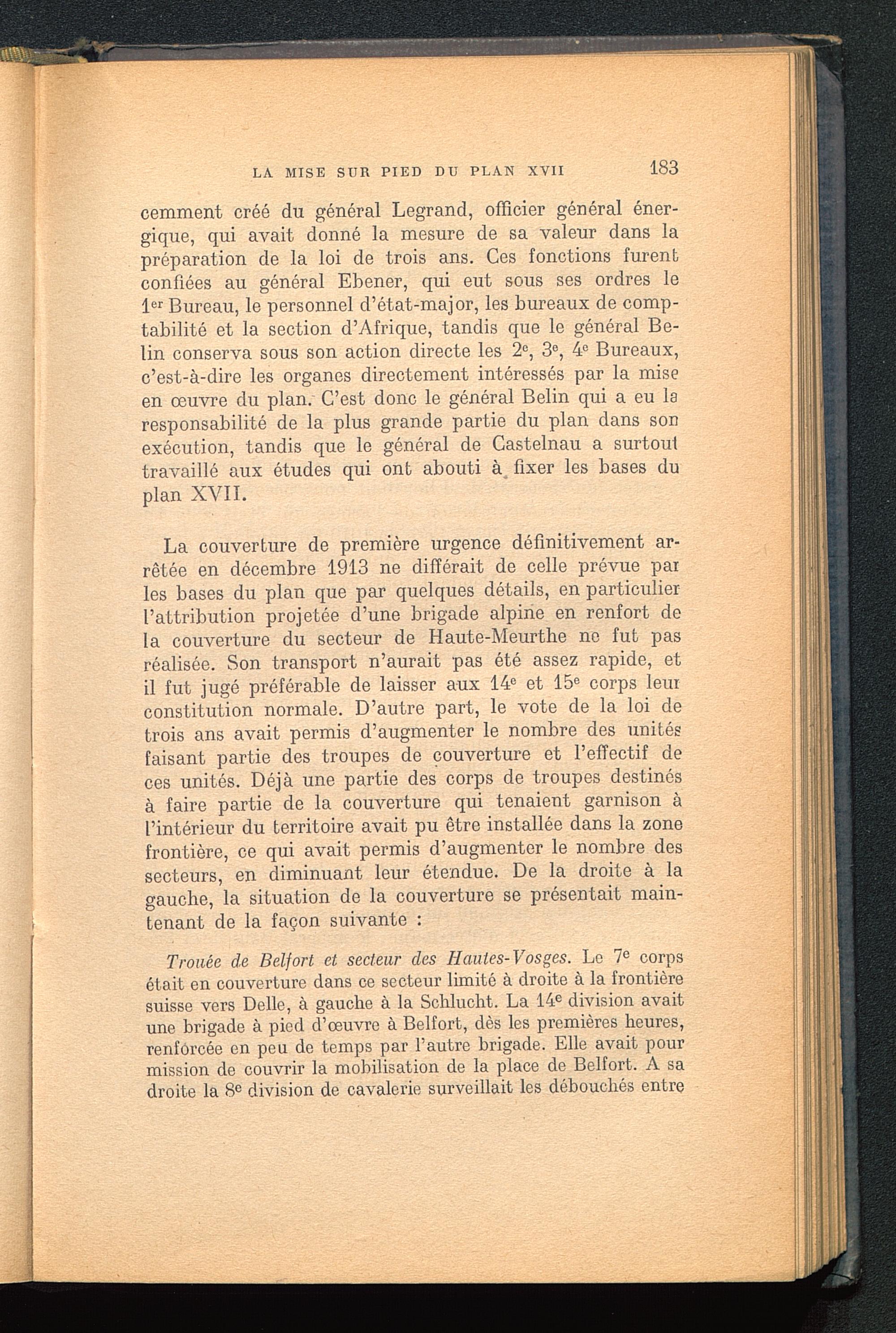Trouée de Belfort et secteur des Hautes-Vosges. Le 7 e corpsétait en couverture dans ce secteur limité à droite à la frontièresuisse vers Delle , à gauche à la Schlucht. La 14 e division avaitune brigade à pied d’œuvre à Belfort , dès les premières heures,renforcée en peu de temps par l’autre brigade. Elle avait pourmission de couvrir la mobilisation de la place de Belfort . A sadroite la 8 e division de cavalerie surveillait les débouchés entre
